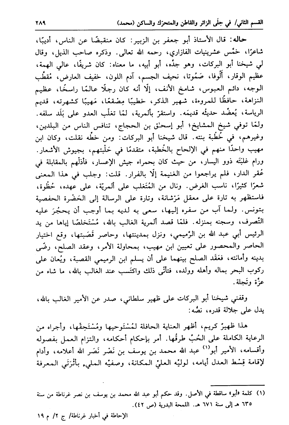 وقفني شيخنا أبو البركات على ظهير سلطاني، صدر عن الأمير الغالب بالله، يدل على جلالة قدره، نصّه: