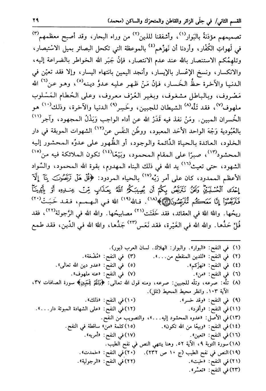 تصميمهم مؤذنة بالبوار «1» ، وأشفقنا للذين «2» من وراء البحار، وقد أصبح معظمهم «3» في لهوات الكفّار، وأردنا أن نهزّهم «4» بالموعظة التي تكحل البصائر بميل الاستبصار، وتلهمكم الاستنصار بالله عند عدم الانتصار، فإن جبر الله الخواطر بالضراعة إليه، والانكسار، ونسخ الإعسار بالإيسار، وأنجد اليمين بانتهاء اليسار، وإلا فقد تعيّن في الدنيا والآخرة حظّ الخسار، فإنّ من ظهر عليه عدوّ دينه «5» ، وهو عن «6» الله مصروف، وبالباطل مشغوف، وبغير العرف معروف، وعلى الحطام المسلوب ملهوف «7» ، فقد تلّه «8» الشيطان للجبين، وخسر «9» الدنيا والآخرة، وذلك «10» هو الخسران المبين. ومن نفذ فيه قدر الله عن أداء الواجب وبذل المجهود، وآجر «11» بالعبودية وجه الواحد الأحد المعبود، ووطّن النفس عن «12» الشهوات الموبقة في دار الخلود، العائدة بالحياة الدّائمة والوجود، أو الظّهور على عدوّه المحشور إليه المحشود «13» ، صبرا على المقام المحمود، وبيعا «14» تكون الملائكة فيه من «15» الشهود، حتى تعيث «16» يد الله في ذلك البناء المهدوم، بقوة الله المحمود، والسّواد الأعظم الممدود، كان على أمر ربّه «17» بالحياء المردود: قُلْ هَلْ تَرَبَّصُونَ بِنا إِلَّا إِحْدَى الْحُسْنَيَيْنِ وَنَحْنُ نَتَرَبَّصُ بِكُمْ أَنْ يُصِيبَكُمُ اللَّهُ بِعَذابٍ مِنْ عِنْدِهِ أَوْ بِأَيْدِينا فَتَرَبَّصُوا إِنَّا مَعَكُمْ مُتَرَبِّصُونَ