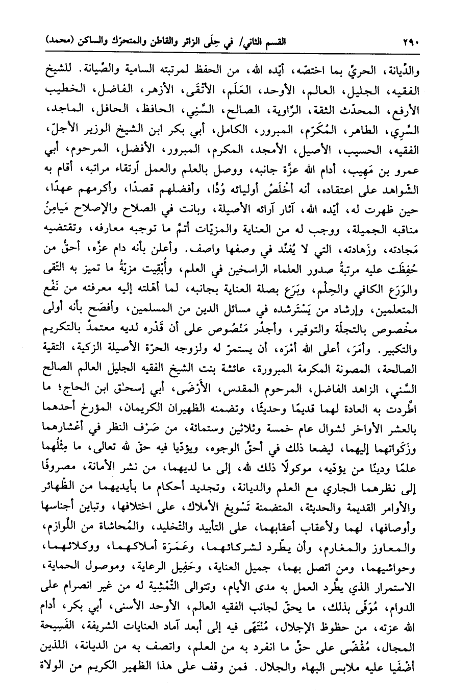 والدّيانة، الحريّ بما اختصّه، أيّده الله، من الحفظ لمرتبته السامية والصّيانة. للشيخ الفقيه، الجليل، العالم، الأوحد، العلم، الأتقى، الأزهر، الفاضل، الخطيب الأرفع، المحدّث الثقة، الرّاوية، الصالح، السّني، الحافظ، الحافل، الماجد، السّري، الطاهر، المكرّم، المبرور، الكامل، أبي بكر ابن الشيخ الوزير الأجلّ، الفقيه، الحسيب، الأصيل، الأمجد، المكرم، المبرور، الأفضل، المرحوم، أبي عمرو بن مهيب، أدام الله عزّة جانبه، ووصل بالعلم والعمل ارتقاء مراتبه، أقام به الشّواهد على اعتقاده، أنه أخلص أوليائه ودّا، وأفضلهم قصدا، وأكرمهم عهدا، حين ظهرت له، أيّده الله، آثار آرائه الأصيلة، وبانت في الصلاح والإصلاح ميامن مناقبه الجميلة، ووجب له من العناية والمزيّات أتمّ ما توجبه معارفه، وتقتضيه مجادته، وزهادته، التي لا يفنّد في وصفها واصف. وأعلن بأنه دام عزّه، أحقّ من حفظت عليه مرتبة صدور العلماء الراسخين في العلم، وأبقيت مزيّة ما تميز به التّقى والورع الكافي والحلم، وبرع بصلة العناية بجانبه، لما أهّلته إليه معرفته من نفع المتعلمين، وإرشاد من يسترشده في مسائل الدين من المسلمين، وأفصح بأنه أولى مخصوص بالتجلّة والتوقير، وأجدر منصوص على أن قدره لديه معتمد بالتكريم والتكبير. وأمر، أعلى الله أمره، أن يستمرّ له ولزوجه الحرّة الأصيلة الزكية، التقية الصالحة، المصونة المكرمة المبرورة، عائشة بنت الشيخ الفقيه الجليل العالم الصالح السّني، الزاهد الفاضل، المرحوم المقدس، الأرضى، أبي إسحاق ابن الحاج؛ ما اطّردت به العادة لهما قديما وحديثا، وتضمنه الظهيران الكريمان، المؤرخ أحدهما بالعشر الأواخر لشوال عام خمسة وثلاثين وستمائة، من صرف النظر في أعشارهما وزكواتهما إليهما، ليضعا ذلك في أحقّ الوجوه، ويؤدّيا فيه حقّ لله تعالى، ما مثلهما علما ودينا من يؤدّيه، موكولا ذلك لله، إلى ما لديهما، من نشر الأمانة، مصروفا إلى نظرهما الجاري مع العلم والديانة، وتجديد أحكام ما بأيديهما من الظّهائر والأوامر القديمة والحديثة، المتضمنة تسويغ الأملاك، على اختلافها، وتباين أجناسها وأوصافها، لهما ولأعقاب أعقابهما، على التأبيد والتّخليد، والمحاشاة من اللّوازم، والمعاوز والمغارم، وأن يطّرد لشركائهما، وعمرة أملاكهما، ووكلائهما، وحواشيهما، ومن اتصل بهما، جميل العناية، وحفيل الرعاية، وموصول الحماية، الاستمرار الذي يطّرد العمل به مدى الأيام، وتتوالى التّمشية له من غير انصرام على الدوام، موفى بذلك، ما يحقّ لجانب الفقيه العالم، الأوحد الأسنى، أبي بكر، أدام الله عزته، من حظوظ الإجلال، منتهى فيه إلى أبعد آماد العنايات الشريفة، الفسيحة المجال، مقضى على حقّ ما انفرد به من العلم، واتصف به من الديانة، اللذين أضفيا عليه ملابس البهاء والجلال. فمن وقف على هذا الظهير الكريم من الولاة