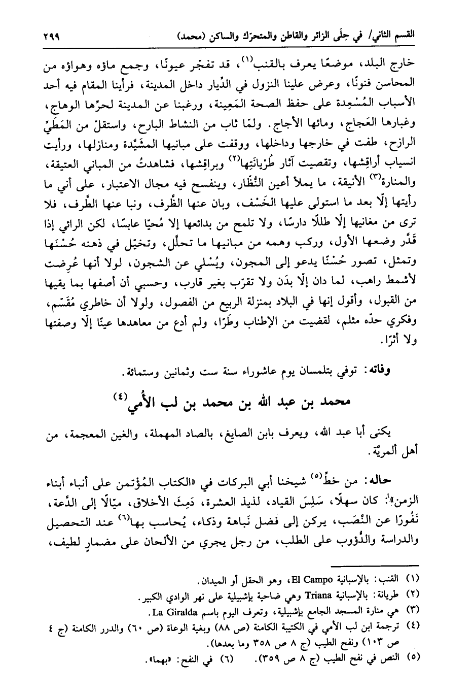 خارج البلد، موضعا يعرف بالقنب «1» ، قد تفجّر عيونا، وجمع ماؤه وهواؤه من المحاسن فنونا، وعرض علينا النزول في الدّيار داخل المدينة، فرأينا المقام فيه أحد الأسباب المسعدة على حفظ الصحة المعينة، ورغبنا عن المدينة لحرّها الوهاج، وغبارها العجاج، ومائها الأجاج. ولمّا ثاب من النشاط البارح، واستقلّ من المطيّ الرازح، طفت في خارجها وداخلها، ووقفت على مبانيها المشيّدة ومنازلها، ورأيت انسياب أراقشها، وتقصيت آثار طريانتها «2» وبراقشها، فشاهدت من المباني العتيقة، والمنارة «3» الأنيقة، ما يملأ أعين النّظّار، وينفسح فيه مجال الاعتبار، على أني ما رأيتها إلّا بعد ما استولى عليها الخسف، وبان عنها الظّرف، ونبا عنها الطّرف، فلا ترى من مغانيها إلّا طللا دارسا، ولا تلمح من بدائعها إلا محيّا عابسا، لكن الرائي إذا قدّر وضعها الأول، وركب وهمه من مبانيها ما تحلّل، وتخيّل في ذهنه حسنها وتمثل، تصور حسنا يدعو إلى المجون، ويسلي عن الشجون، لولا أنها عرضت لأشمط راهب، لما دان إلّا بدن ولا تقرّب بغير قارب، وحسبي أن أصفها بما يقيها من القبول، وأقول إنها في البلاد بمنزلة الربيع من الفصول، ولولا أن خاطري مقسّم، وفكري حدّه مثلم، لقضيت من الإطناب وطرا، ولم أدع من معاهدها عينا إلّا وصفتها ولا أثرا.