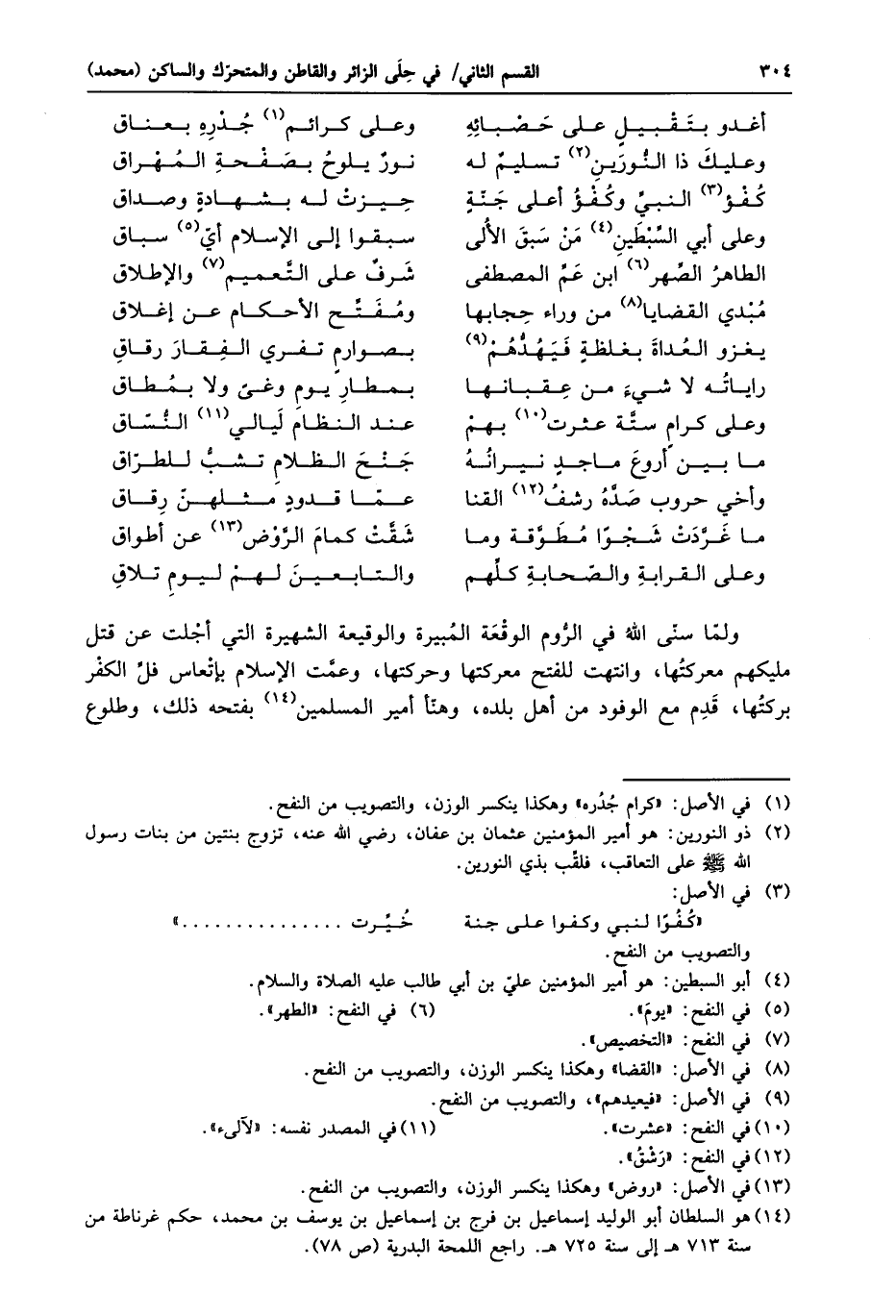 ولمّا سنّى الله في الرّوم الوقعة المبيرة والوقيعة الشهيرة التي أجلت عن قتل مليكهم معركتها، وانتهت للفتح معركتها وحركتها، وعمّت الإسلام بإتعاس فلّ الكفر بركتها، قدم مع الوفود من أهل بلده، وهنّأ أمير المسلمين «14» بفتحه ذلك، وطلوع