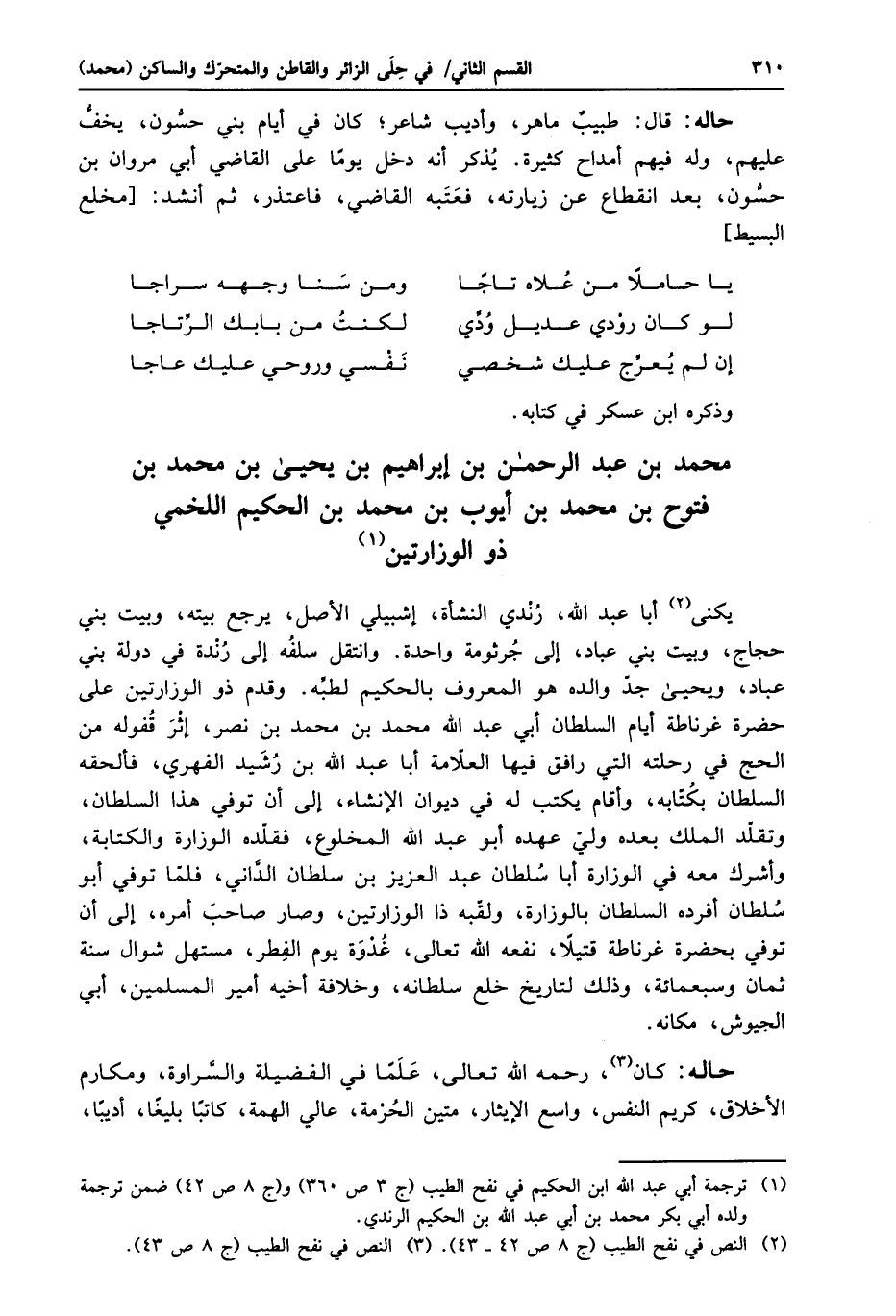 يكنى «2» أبا عبد الله، رندي النشأة، إشبيلي الأصل، يرجع بيته، وبيت بني حجاج، وبيت بني عباد، إلى جرثومة واحدة. وانتقل سلفه إلى رندة في دولة بني عباد، ويحيى جدّ والده هو المعروف بالحكيم لطبّه. وقدم ذو الوزارتين على حضرة غرناطة أيام السلطان أبي عبد الله محمد بن محمد بن نصر، إثر قفوله من الحج في رحلته التي رافق فيها العلّامة أبا عبد الله بن رشيد الفهري، فألحقه السلطان بكتّابه، وأقام يكتب له في ديوان الإنشاء، إلى أن توفي هذا السلطان، وتقلّد الملك بعده وليّ عهده أبو عبد الله المخلوع، فقلّده الوزارة والكتابة، وأشرك معه في الوزارة أبا سلطان عبد العزيز بن سلطان الدّاني، فلمّا توفي أبو سلطان أفرده السلطان بالوزارة، ولقّبه ذا الوزارتين، وصار صاحب أمره، إلى أن توفي بحضرة غرناطة قتيلا، نفعه الله تعالى، غدوة يوم الفطر، مستهل شوال سنة ثمان وسبعمائة، وذلك لتاريخ خلع سلطانه، وخلافة أخيه أمير المسلمين، أبي الجيوش، مكانه.