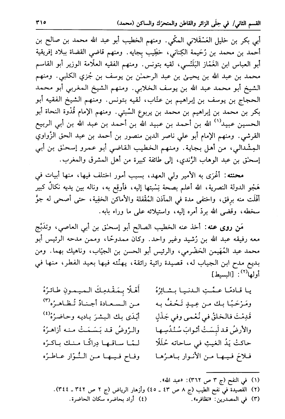 أبي بكر بن خليل العسقلاني المكّي. ومنهم الخطيب أبو عبد الله محمد بن صالح بن أحمد بن محمد بن رحيمة الكناني، خطيب بجايه. ومنهم قاضي القضاة ببلاد إفريقية أبو العباس ابن الغمّاز البلنسي، لقيه بتونس. ومنهم الفقيه العلّامة الوزير أبو القاسم محمد بن عبد الله بن يحيى بن عبد الرحمن بن يوسف بن جزي الكلبي. ومنهم الشيخ أبو محمد عبد الله بن يوسف الخلابي. ومنهم الشيخ المغربي أبو محمد الحجاج بن يوسف بن إبراهيم بن عتّاب، لقيه بتونس. ومنهم الشيخ الفقيه أبو بكر بن محمد بن إبراهيم بن محمد بن يربوع السّبتي. ومنهم الإمام قدوة النحاة أبو الحسين عبيد «1» الله بن أحمد بن عبيد الله بن أحمد بن عبد الله بن أبي الربيع القرشي. ومنهم الإمام أبو علي ناصر الدين منصور بن أحمد بن عبد الحق الزّواوي المشدالي، من أهل بجاية. ومنهم الخطيب القاضي أبو عمرو إسحاق بن أبي إسحاق بن عبد الوهاب الرّندي، إلى طائفة كبيرة من أهل المشرق والمغرب.