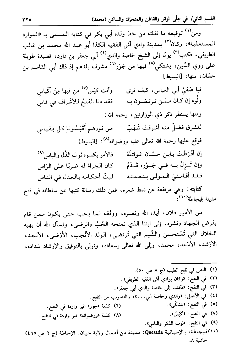 بمدينة وادي آش الفقيه الكذا أبو عبد الله محمد بن غالب الطريفي، فكتب «3» يوما إلى الشيخ خاصة والدي «4» أبي جعفر بن داود، قصيدة طويلة على روي السّين، يشتكي «5» فيها من جور «6» مشرف بلدهم إذ ذاك أبي القاسم بن حسّان، منها: [البسيط]