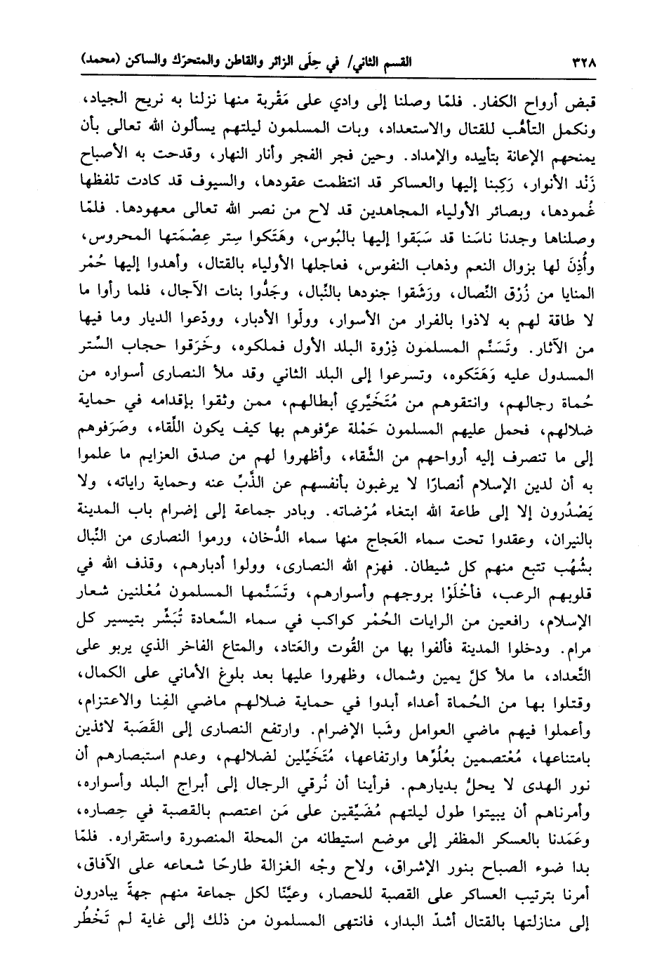 قبض أرواح الكفار. فلمّا وصلنا إلى وادي على مقربة منها نزلنا به نريح الجياد، ونكمل التأهّب للقتال والاستعداد، وبات المسلمون ليلتهم يسألون الله تعالى بأن يمنحهم الإعانة بتأييده والإمداد. وحين فجر الفجر وأنار النهار، وقدحت به الأصباح زند الأنوار، ركبنا إليها والعساكر قد انتظمت عقودها، والسيوف قد كادت تلفظها غمودها، وبصائر الأولياء المجاهدين قد لاح من نصر الله تعالى معهودها. فلمّا وصلناها وجدنا ناسنا قد سبقوا إليها بالبوس، وهتكوا ستر عصمتها المحروس، وأذن لها بزوال النعم وذهاب النفوس، فعاجلها الأولياء بالقتال، وأهدوا إليها حمر المنايا من زرق النّصال، ورشقوا جنودها بالنّبال، وجدّوا بنات الآجال، فلما رأوا ما لا طاقة لهم به لاذوا بالفرار من الأسوار، وولّوا الأدبار، وودّعوا الديار وما فيها من الآثار. وتسنّم المسلمون ذروة البلد الأول فملكوه، وخرقوا حجاب السّتر المسدول عليه وهتكوه، وتسرعوا إلى البلد الثاني وقد ملأ النصارى أسواره من حماة رجالهم، وانتقوهم من متخيّري أبطالهم، ممن وثقوا بإقدامه في حماية ضلالهم، فحمل عليهم المسلمون حملة عرّفوهم بها كيف يكون اللّقاء، وصرفوهم إلى ما تنصرف إليه أرواحهم من الشّقاء، وأظهروا لهم من صدق العزائم ما علموا به أن لدين الإسلام أنصارا لا يرغبون بأنفسهم عن الذّبّ عنه وحماية راياته، ولا يصدرون إلا إلى طاعة الله ابتغاء مرضاته. وبادر جماعة إلى إضرام باب المدينة بالنيران، وعقدوا تحت سماء العجاج منها سماء الدّخان، ورموا النصارى من النّبال بشهب تتبع منهم كل شيطان. فهزم الله النصارى، وولوا أدبارهم، وقذف الله في قلوبهم الرعب، فأخلوا بروجهم وأسوارهم، وتسنّمها المسلمون معلنين شعار الإسلام، رافعين من الرايات الحمر كواكب في سماء السّعادة تبشّر بتيسير كل مرام. ودخلوا المدينة فألفوا بها من القوت والعتاد، والمتاع الفاخر الذي يربو على التّعداد، ما ملأ كلّ يمين وشمال، وظهروا عليها بعد بلوغ الأماني على الكمال، وقتلوا بها من الحماة أعداء أبدوا في حماية ضلالهم ماضي الفنا والاعتزام، وأعملوا فيهم ماضي العوامل وشبا الإضرام. وارتفع النصارى إلى القصبة لائذين بامتناعها، معتصمين بعلوّها وارتفاعها، متخيّلين لضلالهم، وعدم استبصارهم أن نور الهدى لا يحلّ بديارهم. فرأينا أن نرقي الرجال إلى أبراج البلد وأسواره، وأمرناهم أن يبيتوا طول ليلتهم مضيّقين على من اعتصم بالقصبة في حصاره، وعمدنا بالعسكر المظفر إلى موضع استيطانه من المحلة المنصورة واستقراره. فلمّا بدا ضوء الصباح بنور الإشراق، ولاح وجه الغزالة طارحا شعاعه على الآفاق، أمرنا بترتيب العساكر على القصبة للحصار، وعيّنّا لكل جماعة منهم جهة يبادرون إلى منازلتها بالقتال أشدّ البدار، فانتهى المسلمون من ذلك إلى غاية لم تخطر