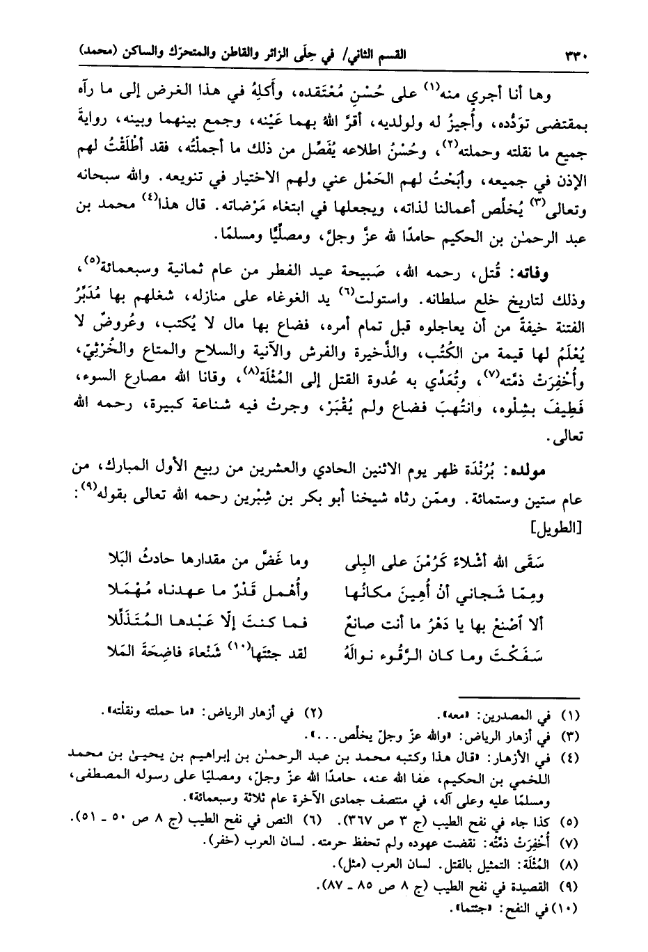 وها أنا أجري منه «1» على حسن معتقده، وأكله في هذا الغرض إلى ما رآه بمقتضى تودّده، وأجيز له ولولديه، أقرّ الله بهما عينه، وجمع بينهما وبينه، رواية جميع ما نقلته وحملته «2» ، وحسن اطلاعه يفصّل من ذلك ما أجملته، فقد أطلقت لهم الإذن في جميعه، وأبحت لهم الحمل عني ولهم الاختيار في تنويعه. والله سبحانه وتعالى «3» يخلّص أعمالنا لذاته، ويجعلها في ابتغاء مرضاته. قال هذا «4» محمد بن عبد الرحمن بن الحكيم حامدا لله عزّ وجلّ، ومصلّيا ومسلما.