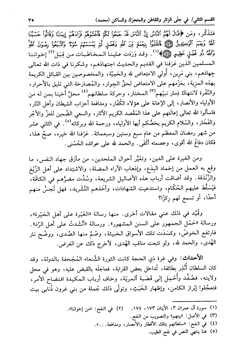 (174) «1» . وقد وردت علينا المخاطبات من قبل «2» إخواننا المسلمين الذين عرفنا في القديم والحديث اجتهادهم، وشكرنا في ذات الله تعالى جهادهم، بني مرين، أولي الامتعاض لله والحميّة، والمخصوصين بين القبائل الكريمة بهذه المزية، بعزمهم على الامتعاض لحقّ الجوار، والمصارخة التي تليق بالأحرار، والنّفرة لانتهاك ذمار نبيّهم «3» المختار، وحركة سلطانهم «4» محلّ أخينا بمن له من الأولياء والأنصار، إلى الإعانة على هؤلاء الكفّار، ومدافعة أحزاب الشيطان وأهل النّار، فاسألوا الله تعالى إعانتهم على هذا المقصد الكريم الآثار، والسعي الضّمين للعزّ والأجر والفخار، والسّلام الكريم يخصّكم أيها الأولياء، ورحمة الله وبركاته «5» . في الثاني عشر من شهر رمضان المعظم من عام سبع وستين وسبعمائة. عرّفنا الله خيره، صحّ هذا، فكان دفاع الله أقوى، وعصمته أكفى. والحمد لله على عوائده الحسنى.