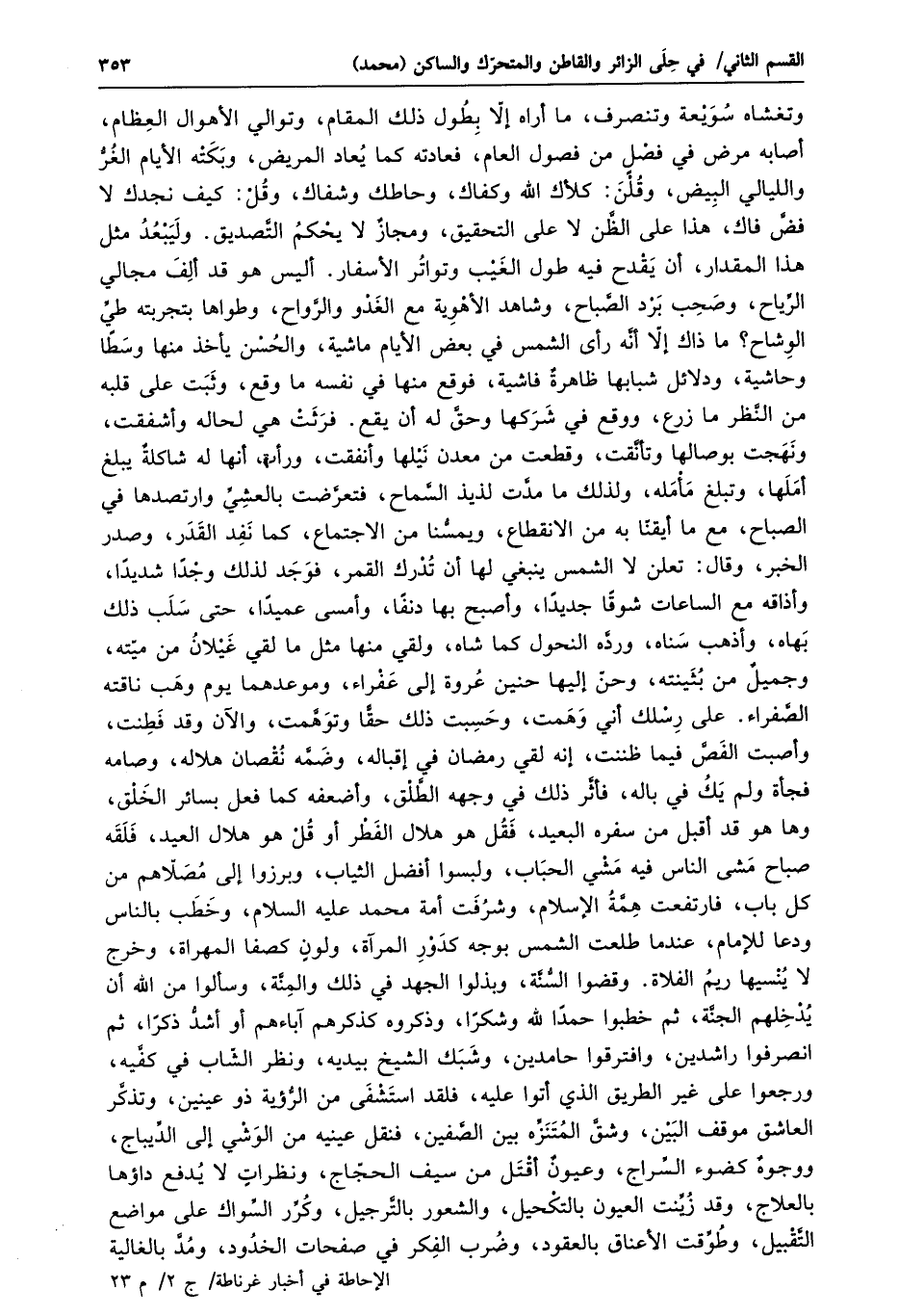 وتغشاه سويعة وتنصرف، ما أراه إلّا بطول ذلك المقام، وتوالي الأهوال العظام، أصابه مرض في فصل من فصول العام، فعادته كما يعاد المريض، وبكته الأيام الغرّ والليالي البيض، وقلن: كلأك الله وكفاك، وحاطك وشفاك، وقل: كيف نجدك لا فضّ فاك، هذا على الظّن لا على التحقيق، ومجاز لا يحكم التّصديق. وليبعد مثل هذا المقدار، أن يقدح فيه طول الغيب وتواتر الأسفار. أليس هو قد ألف مجالي الرّياح، وصحب برد الصّباح، وشاهد الأهوية مع الغدو والرّواح، وطواها بتجربته طيّ الوشاح؟ ما ذاك إلّا أنّه رأى الشمس في بعض الأيام ماشية، والحسن يأخذ منها وسطا وحاشية، ودلائل شبابها ظاهرة فاشية، فوقع منها في نفسه ما وقع، وثبت على قلبه من النّظر ما زرع، ووقع في شركها وحقّ له أن يقع. فرثت هي لحاله وأشفقت، ونهجت بوصالها وتأنّقت، وقطعت من معدن نيلها وأنفقت، ورأت أنها له شاكلة يبلغ أملها، وتبلغ مأمله، ولذلك ما مدّت لذيذ السّماح، فتعرّضت بالعشيّ وارتصدها في الصباح، مع ما أيقنّا به من الانقطاع، ويمسّنا من الاجتماع، كما نفد القدر، وصدر الخبر، وقال: تعلن لا الشمس ينبغي لها أن تدرك القمر، فوجد لذلك وجدا شديدا، وأذاقه مع الساعات شوقا جديدا، وأصبح بها دنفا، وأمسى عميدا، حتى سلب ذلك بهاه، وأذهب سناه، وردّه النحول كما شاه، ولقي منها مثل ما لقي غيلان من ميّته، وجميل من بثينته، وحنّ إليها حنين عروة إلى عفراء، وموعدهما يوم وهب ناقته الصّفراء. على رسلك أني وهمت، وحسبت ذلك حقّا وتوهّمت، والآن وقد فطنت، وأصبت الفصّ فيما ظننت، إنه لقي رمضان في إقباله، وضمّه نقصان هلاله، وصامه فجأة ولم يك في باله، فأثّر ذلك في وجهه الطّلق، وأضعفه كما فعل بسائر الخلق، وها هو قد أقبل من سفره البعيد، فقل هو هلال الفطر أو قل هو هلال العيد، فلقه صباح مشى الناس فيه مشي الحباب، ولبسوا أفضل الثياب، وبرزوا إلى مصلّاهم من كل باب، فارتفعت همّة الإسلام، وشرفت أمة محمد عليه السلام، وخطب بالناس ودعا للإمام، عندما طلعت الشمس بوجه كدور المرآة، ولون كصفا المهراة، وخرج لا ينسيها ريم الفلاة. وقضوا السّنّة، وبذلوا الجهد في ذلك والمنّة، وسألوا من الله أن يدخلهم الجنّة، ثم خطبوا حمدا لله وشكرا، وذكروه كذكرهم آباءهم أو أشدّ ذكرا، ثم انصرفوا راشدين، وافترقوا حامدين، وشبك الشيخ بيديه، ونظر الشّاب في كفّيه، ورجعوا على غير الطريق الذي أتوا عليه، فلقد استشفى من الرّؤية ذو عينين، وتذكّر العاشق موقف البين، وشقّ المتنزّه بين الصّفين، فنقل عينيه من الوشي إلى الدّيباج، ووجوه كضوء السّراج، وعيون أقتل من سيف الحجّاج، ونظرات لا يدفع داؤها بالعلاج، وقد زيّنت العيون بالتكحيل، والشعور بالتّرجيل، وكرّر السّواك على مواضع التّقبيل، وطوّقت الأعناق بالعقود، وضرب الفكر في صفحات الخدود، ومدّ بالغالية