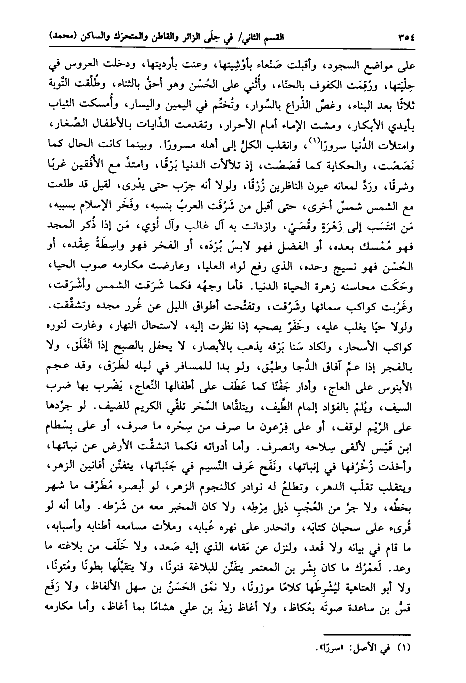 على مواضع السجود، وأقبلت صنعاء بأوشيتها، وعنت بأرديتها، ودخلت العروس في حليتها، ورقمت الكفوف بالحنّاء، وأثني على الحسن وهو أحقّ بالثناء، وطلّقت التّوبة ثلاثا بعد البناء، وغصّ الذّراع بالسّوار، وتختّم في اليمين واليسار، وأمسكت الثياب بأيدي الأبكار، ومشت الإماء أمام الأحرار، وتقدمت الدّايات بالأطفال الصّغار، وامتلأت الدّنيا سرورا «1» ، وانقلب الكلّ إلى أهله مسرورا. وبينما كانت الحال كما نصصت، والحكاية كما قصصت، إذ تلألأت الدنيا برقا، وامتدّ مع الأفقين غربا وشرقا، وردّ لمعانه عيون الناظرين زرقا، ولولا أنه جرّب حتى يدرى، لقيل قد طلعت مع الشمس شمس أخرى، حتى أقبل من شرفت العرب بنسبه، وفخر الإسلام بسببه، من انتسب إلى زهرة وقصيّ، وازدانت به آل غالب وآل لؤي، من إذا ذكر المجد فهو ممسك بعده، أو الفضل فهو لابس برده، أو الفخر فهو واسطة عقده، أو الحسن فهو نسيج وحده، الذي رفع لواء العليا، وعارضت مكارمه صوب الحيا، وحكت محاسنه زهرة الحياة الدنيا. فأما وجهه فكما شرقت الشمس وأشرقت، وغربت كواكب سمائها وشرقت، وتفتّحت أطواق الليل عن غرر مجده وتشقّقت.