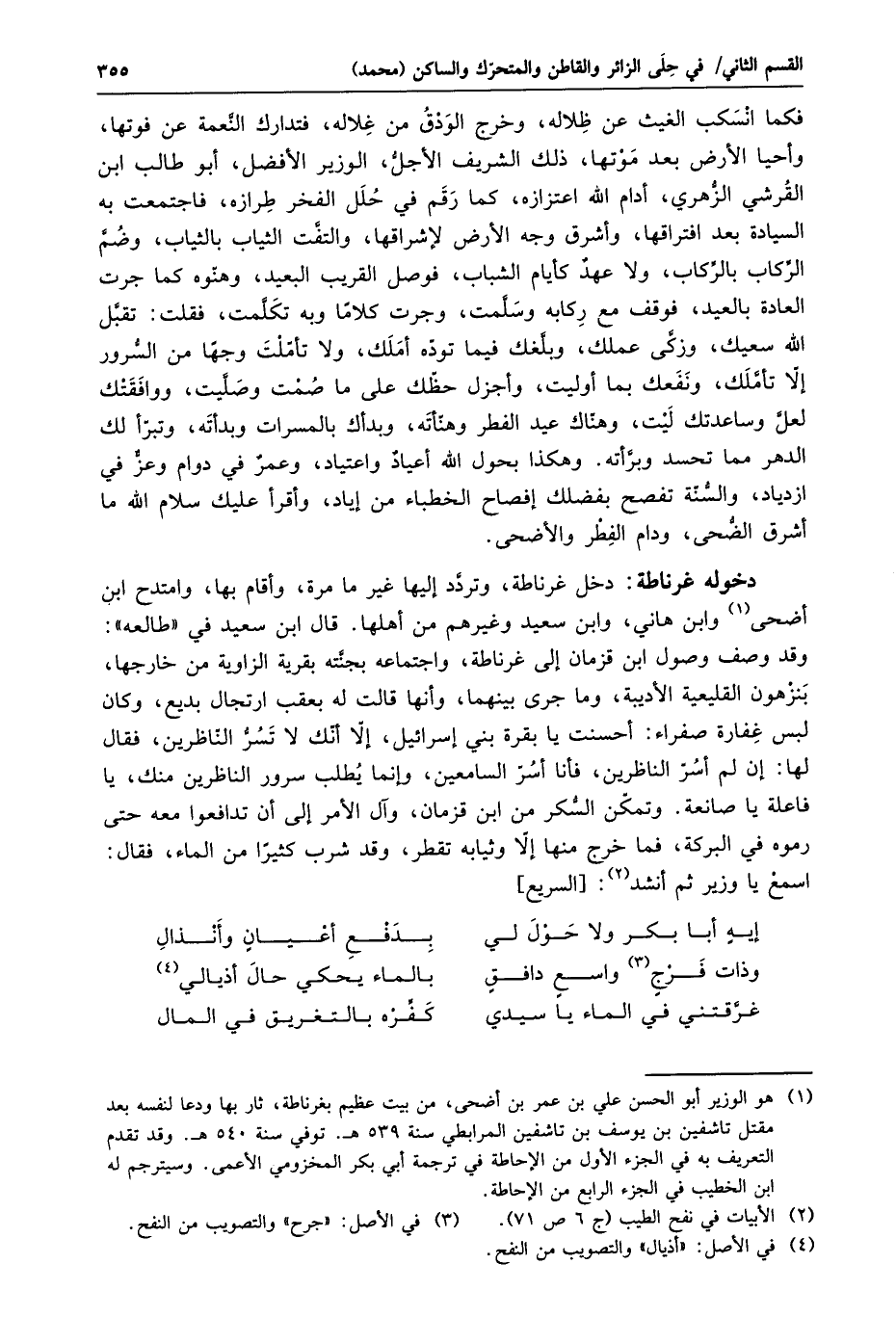 فكما انسكب الغيث عن ظلاله، وخرج الودق من غلاله، فتدارك النّعمة عن فوتها، وأحيا الأرض بعد موتها، ذلك الشريف الأجلّ، الوزير الأفضل، أبو طالب ابن القرشي الزّهري، أدام الله اعتزازه، كما رقم في حلل الفخر طرازه، فاجتمعت به السيادة بعد افتراقها، وأشرق وجه الأرض لإشراقها، والتفّت الثياب بالثياب، وضمّ الرّكاب بالرّكاب، ولا عهد كأيام الشباب، فوصل القريب البعيد، وهنّوه كما جرت العادة بالعيد، فوقف مع ركابه وسلّمت، وجرت كلاما وبه تكلّمت، فقلت: تقبّل الله سعيك، وزكّى عملك، وبلّغك فيما تودّه أملك، ولا تأمّلت وجها من السّرور إلّا تأمّلك، ونفعك بما أوليت، وأجزل حظّك على ما صمت وصلّيت، ووافقتك لعلّ وساعدتك ليت، وهنّاك عيد الفطر وهنّأته، وبدأك بالمسرات وبدأته، وتبرّأ لك الدهر مما تحسد وبرّأته. وهكذا بحول الله أعياد واعتياد، وعمر في دوام وعزّ في ازدياد، والسّنّة تفصح بفضلك إفصاح الخطباء من إياد، وأقرأ عليك سلام الله ما أشرق الضّحى، ودام الفطر والأضحى.
