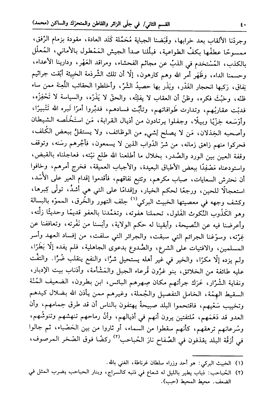 وجردنا الألقاب بعد خرابها، وقبضنا الجباية محمّلة كتد العادة، مقودة بزمام الرّفق، ممسوحا عطفها بكفّ الطواعية، فبلّلنا صدأ الجيش الممطول بالأماني، المعلّل بالكذب، المستخدم في الذبّ عن مجاثم الفحشاء، ومراقد العهر، ودارينا الأعداء، وحسمنا الداء، وظهر أمر الله وهم كارهون، إلّا أن تلك الشّر ذمة الخبيثة أبقت جراثيم نفاق، ركبها انحجار الغدر، وبذر بها حصيد الشّرّ، وأخلطوا الحقائب اللّعنة ممن ساء ظنّه، وخبث فكره، وظنّ أن العقاب لا يفلته، والحقّ لا يذره، والسياسة لا تحفزه، فدبّت عقاربهم، وتدارت طوافاتهم، وتأبّت فسادهم، فدبّروا أمرا تبره الله تتبيرا، وأوسعه خزيا وبيلا، وجفلوا يرتادون من أذيال القرابة، من استخلصه الشيطان وأصحبه الخذلان، من لا يصلح لشيء من الوظائف، ولا يستقلّ ببعض الكلف، فحركوا منهم زاهق زمانه، من شرّ الدّواب الذين لا يسمعون، فأجّرهم رسنه، وتوقف وقفة العين بين الورد والصّدر، بخلال ما أطلعنا الله طلع نيّته، فعاجلناه بالقبض، واستودعناه مصفدا ببعض الأطباق البعيدة، والأجباب العميقة، فخرج أمرهم، وخافوا أن نحترش السعايات، صباب مكرهم، وتتبع نفاقهم، فأقدموا إقدام العير على الأسد، استعجالا للحين، ورجعا لحكم الخيار، وإقداما على التي هي أشدّ، تولّى كبرها، وكشف وجهه في معصيتها الخبيث البركي «1» حلف التهور والخرق، المموّه بالبسالة وهو الكذوب النّكوث الفلول، تحملنا هفوته، وتغمّدنا بالعفو قديما وحديثا زلّته، وأعرضنا فيه عن النّصيحة، وأبقينا له حكم الولاية، وأنسنا من نفرته، وتعاففنا عن غرّته، وسوّغنا الجرائم التي سبقت، والجرائر التي سلفت، من إفساد العهد وأسر المسلمين، والافتيات على الشرع، والصّدوع بدعوى الجاهلية، فلم يفده إلّا بطرا، ولم يزده إلّا مكرا، والخير في غير أهله يستحيل شرّا، والنفع ينقلب ضرّا. والتفّت عليه طائفة من الخلائق، بنو غرّون قرعاء الجبل والمشأمة، وأذناب بيت الإدبار، ونفاية الشرّار، عرك جرأتهم مكان صهرهم البائس، ابن بطرون، الضعيف المنّة السقيط الهمّة، الخامل التفصيل والجملة، وغيرهم ممن يأذن الله بضلال كيدهم وتخييب سعيهم، فاقتحموا البلد صبيحة يهتفون بالناس أن قد طرق حمامهم، وأن العدو قد دهمهم، ملتفتين يرون أنهم في أذيالهم، وأنّ رماحهم تنهشهم وتنوشهم، وسرعانهم ترهقهم، كأنهم سقطوا من السماء، أو ثاروا من بين الحصباء، ثم جالوا في أزقّة البلد يقذفون في الصّفاح نار الحباحب «2» ركضا فوق الصّخر المرصوف،