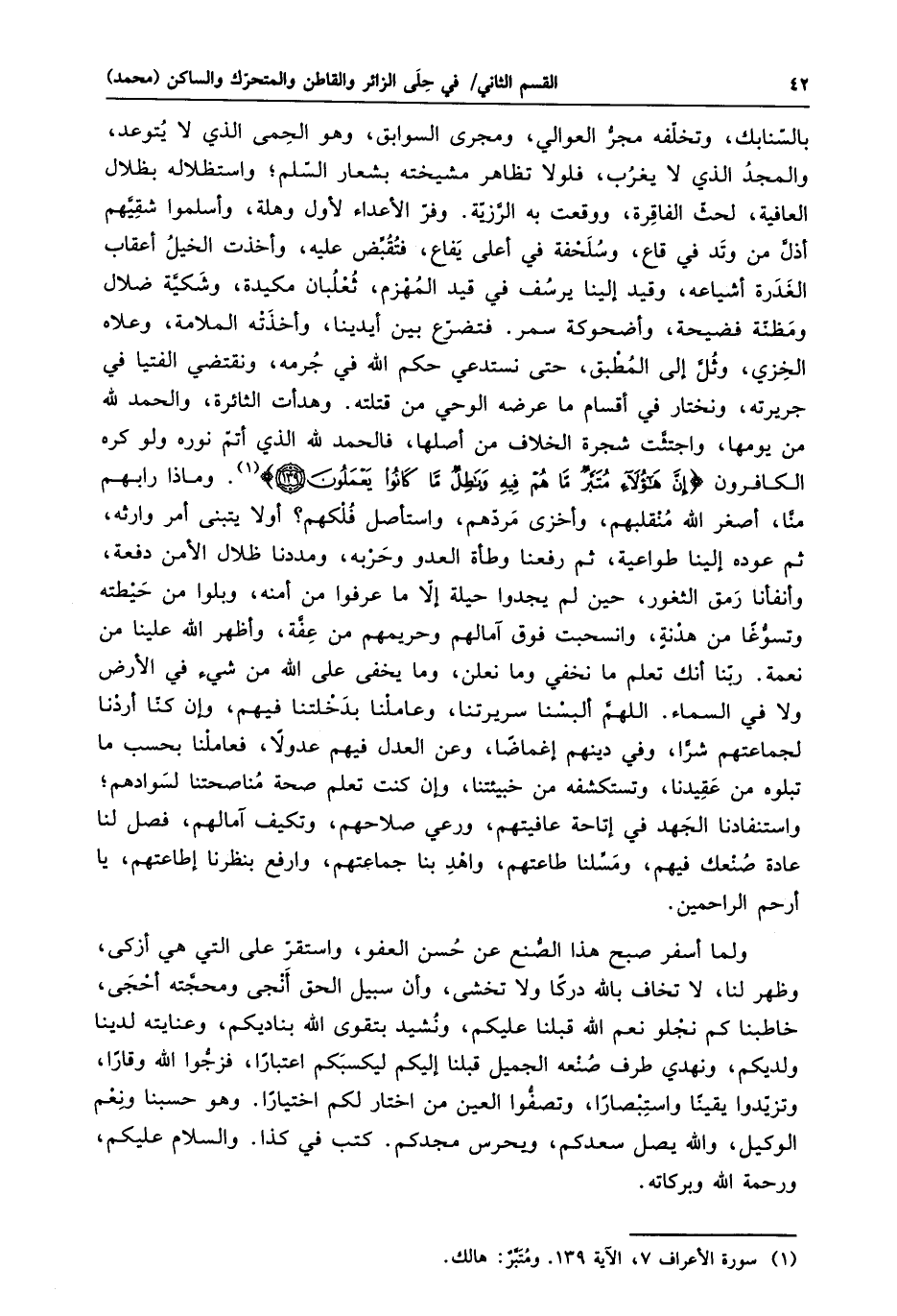 ولما أسفر صبح هذا الصّنع عن حسن العفو، واستقرّ على التي هي أزكى، وظهر لنا، لا تخاف بالله دركا ولا تخشى، وأن سبيل الحق أنجى ومحجّته أحجى، خاطبنا كم نجلو نعم الله قبلنا عليكم، ونشيد بتقوى الله بناديكم، وعنايته لدينا ولديكم، ونهدي طرف صنعه الجميل قبلنا إليكم ليكسبكم اعتبارا، فزجّوا الله وقارا، وتزيّدوا يقينا واستبصارا، وتصفّوا العين من اختار لكم اختيارا. وهو حسبنا ونعم الوكيل، والله يصل سعدكم، ويحرس مجدكم. كتب في كذا. والسلام عليكم، ورحمة الله وبركاته.
