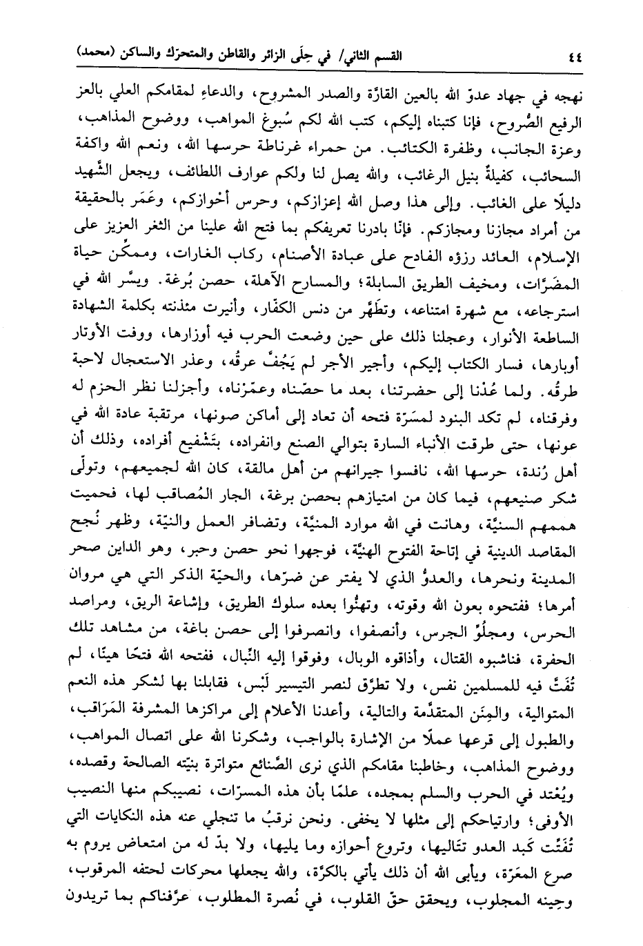 نهجه في جهاد عدوّ الله بالعين القارّة والصدر المشروح، والدعاء لمقامكم العلي بالعز الرفيع الصّروح، فإنا كتبناه إليكم، كتب الله لكم سبوغ المواهب، ووضوح المذاهب، وعزة الجانب، وظفرة الكتائب. من حمراء غرناطة حرسها الله، ونعم الله واكفة السحائب، كفيلة بنيل الرغائب، والله يصل لنا ولكم عوارف اللطائف، ويجعل الشّهيد دليلا على الغائب. وإلى هذا وصل الله إعزازكم، وحرس أحوازكم، وعمر بالحقيقة من أمراد مجازنا ومجازكم. فإنّا بادرنا تعريفكم بما فتح الله علينا من الثغر العزيز على الإسلام، العائد رزؤه الفادح على عبادة الأصنام، ركاب الغارات، وممكّن حياة المضرّات، ومخيف الطريق السابلة؛ والمسارح الآهلة، حصن برغة. ويسّر الله في استرجاعه، مع شهرة امتناعه، وتطهّر من دنس الكفّار، وأنيرت مئذنته بكلمة الشهادة الساطعة الأنوار، وعجلنا ذلك على حين وضعت الحرب فيه أوزارها، ووفت الأوتار أوبارها، فسار الكتاب إليكم، وأجير الأجر لم يجفّ عرقه، وعذر الاستعجال لاحبة طرقه. ولما عدنا إلى حضرتنا، بعد ما حصّناه وعمّرناه، وأجزلنا نظر الحزم له وفرقناه، لم تكد البنود لمسرّة فتحه أن تعاد إلى أماكن صونها، مرتقبة عادة الله في عونها، حتى طرقت الأنباء السارة بتوالي الصنع وانفراده، بتشفيع أفراده، وذلك أن أهل رندة، حرسها الله، نافسوا جيرانهم من أهل مالقة، كان الله لجميعهم، وتولّى شكر صنيعهم، فيما كان من امتيازهم بحصن برغة، الجار المصاقب لها، فحميت هممهم السنيّة، وهانت في الله موارد المنيّة، وتضافر العمل والنيّة، وظهر نجح المقاصد الدينية في إتاحة الفتوح الهنيّة، فوجهوا نحو حصن وحبر، وهو الداين صحر المدينة ونحرها، والعدوّ الذي لا يفتر عن ضرّها، والحيّة الذكر التي هي مروان أمرها؛ ففتحوه بعون الله وقوته، وتهنّوا بعده سلوك الطريق، وإشاعة الريق، ومراصد الحرس، ومجلوّ الجرس، وأنصفوا، وانصرفوا إلى حصن باغة، من مشاهد تلك الحفرة، فناشبوه القتال، وأذاقوه الوبال، وفوقوا إليه النّبال، ففتحه الله فتحا هينا، لم تفتّ فيه للمسلمين نفس، ولا تطرّق لنصر التيسير لبس، فقابلنا بها لشكر هذه النعم المتوالية، والمنن المتقدّمة والتالية، وأعدنا الأعلام إلى مراكزها المشرفة المراقب، والطبول إلى قرعها عملا من الإشارة بالواجب، وشكرنا الله على اتصال المواهب، ووضوح المذاهب، وخاطبنا مقامكم الذي نرى الصّنائع متواترة بنيّته الصالحة وقصده، ويعتد في الحرب والسلم بمجده، علما بأن هذه المسرّات، نصيبكم منها النصيب الأوفى؛ وارتياحكم إلى مثلها لا يخفى. ونحن نرقب ما تنجلي عنه هذه النكايات التي تفتّت كبد العدو تتاليها، وتروع أحوازه وما يليها، ولا بدّ له من امتعاض يروم به صرع المعرّة، ويأبى الله أن ذلك يأتي بالكرّة، والله يجعلها محركات لحتفه المرقوب، وحينه المجلوب، ويحقق حقّ القلوب، في نصرة المطلوب، عرّفناكم بما تريدون