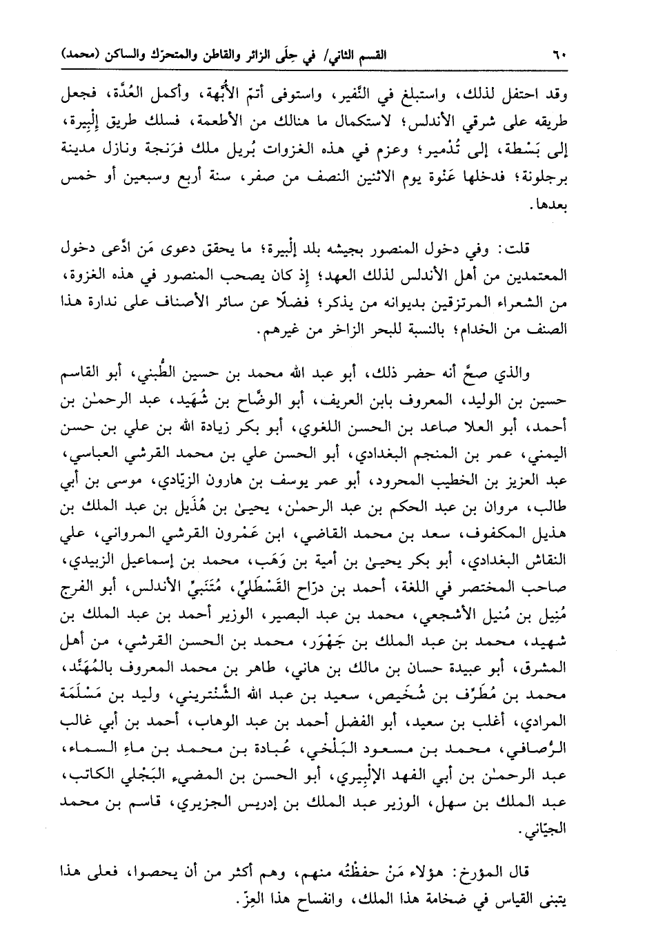 قلت: وفي دخول المنصور بجيشه بلد إلبيرة؛ ما يحقق دعوى من ادّعى دخول المعتمدين من أهل الأندلس لذلك العهد؛ إذ كان يصحب المنصور في هذه الغزوة، من الشعراء المرتزقين بديوانه من يذكر؛ فضلا عن سائر الأصناف على ندارة هذا الصنف من الخدام؛ بالنسبة للبحر الزاخر من غيرهم.