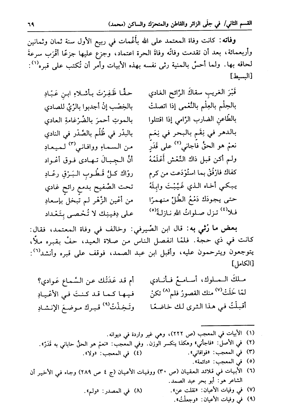 بعض ما رثي به: قال ابن الصّيرفي: وخالف في وفاة المعتمد، فقال: