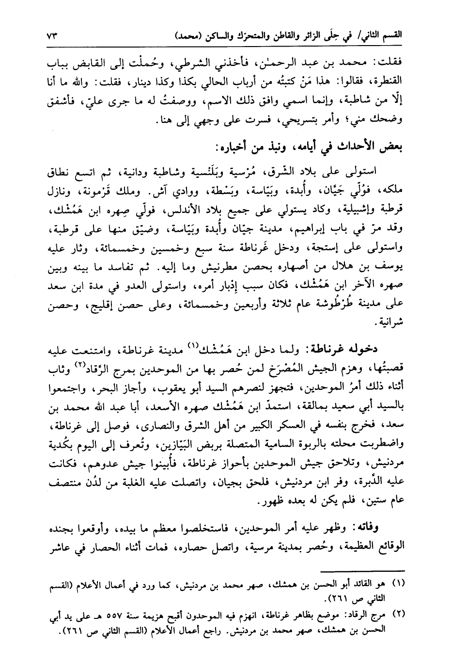 فقلت: محمد بن عبد الرحمن، فأخذني الشرطي، وحملت إلى القابض بباب القنطرة، فقالوا: هذا من كتبته من أرباب الحالي بكذا وكذا دينار، فقلت: والله ما أنا إلّا من شاطبة، وإنما اسمي وافق ذلك الاسم، ووصفت له ما جرى عليّ، فأشفق وضحك مني؛ وأمر بتسريحي، فسرت على وجهي إلى هنا.