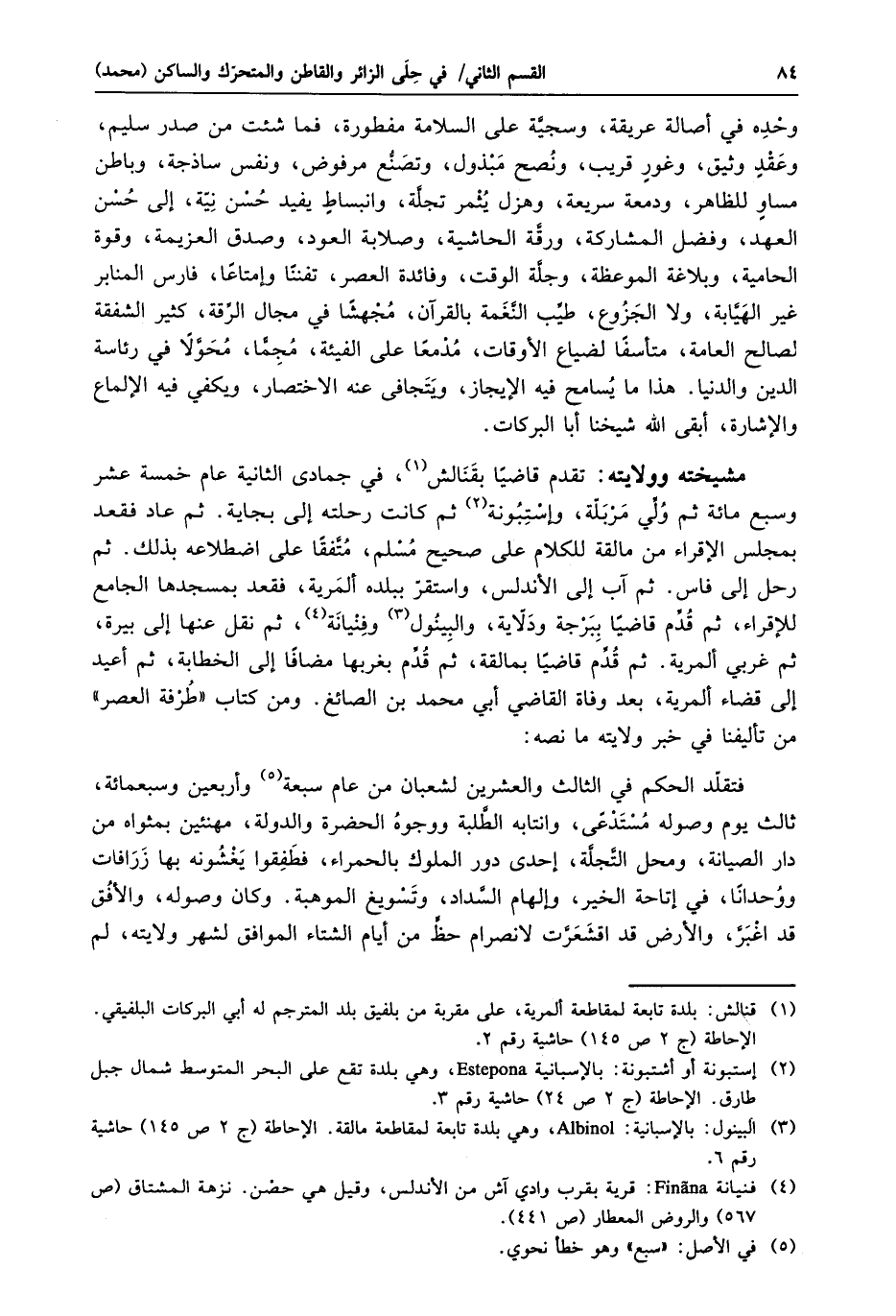 مشيخته وولايته: تقدم قاضيا بقنالش «1» ، في جمادى الثانية عام خمسة عشر وسبع مائة ثم ولّي مربلّة، وإستبونة «2» ثم كانت رحلته إلى بجاية. ثم عاد فقعد بمجلس الإقراء من مالقة للكلام على صحيح مسلم، متّفقا على اضطلاعه بذلك. ثم رحل إلى فاس. ثم آب إلى الأندلس، واستقرّ ببلده ألمرية، فقعد بمسجدها الجامع للإقراء، ثم قدّم قاضيا ببرجة ودلّاية، والبينول «3» وفنيانة «4» ، ثم نقل عنها إلى بيرة، ثم غربي ألمرية. ثم قدّم قاضيا بمالقة، ثم قدّم بغربها مضافا إلى الخطابة، ثم أعيد إلى قضاء ألمرية، بعد وفاة القاضي أبي محمد بن الصائغ. ومن كتاب «طرفة العصر» من تأليفنا في خبر ولايته ما نصه:
