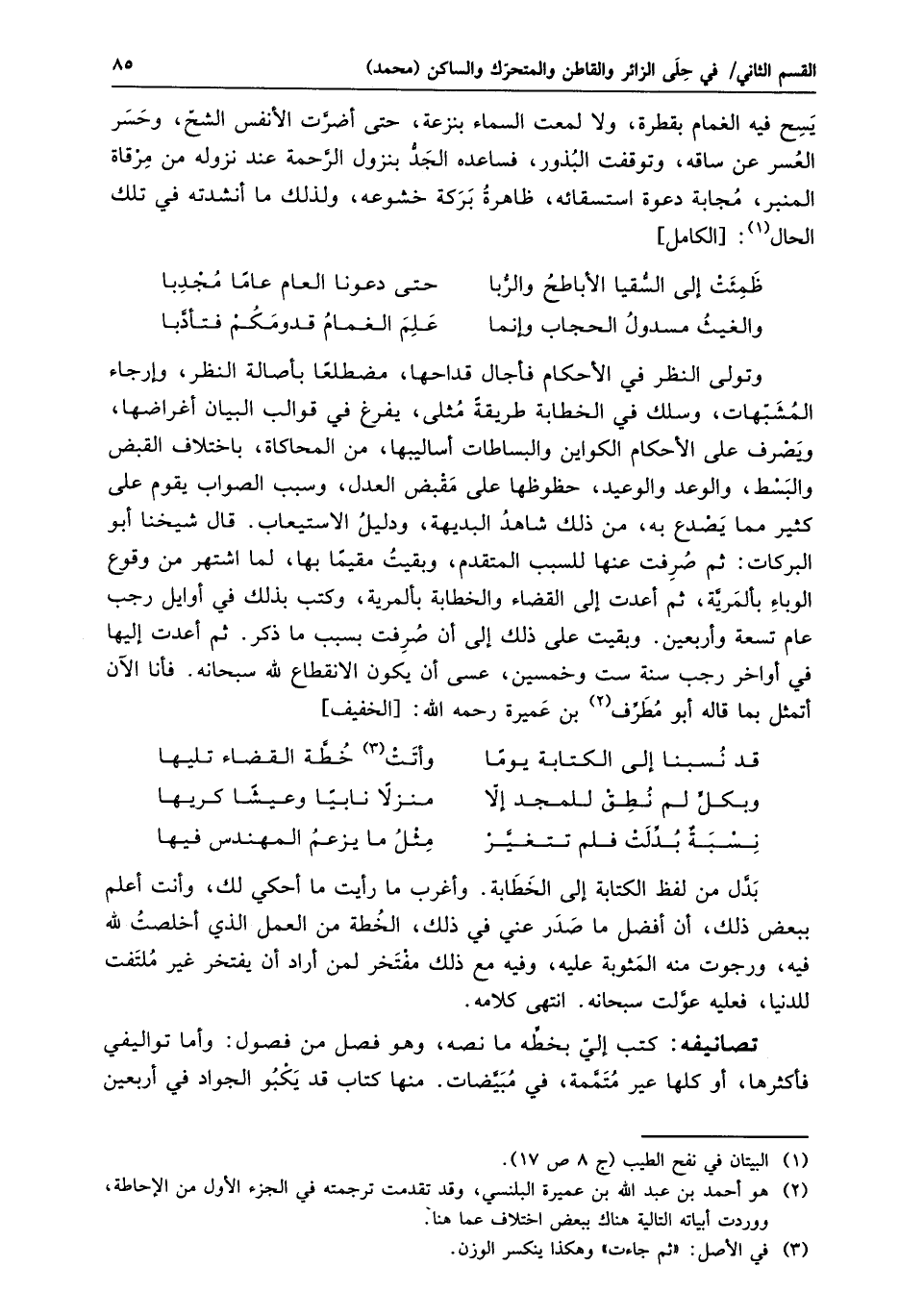 وتولى النظر في الأحكام فأجال قداحها، مضطلعا بأصالة النظر، وإرجاء المشبّهات، وسلك في الخطابة طريقة مثلى، يفرغ في قوالب البيان أغراضها، ويصرف على الأحكام الكوائن والبساطات أساليبها، من المحاكاة، باختلاف القبض والبسط، والوعد والوعيد، حظوظها على مقبض العدل، وسبب الصواب يقوم على كثير مما يصدع به، من ذلك شاهد البديهة، ودليل الاستيعاب. قال شيخنا أبو البركات: ثم صرفت عنها للسبب المتقدم، وبقيت مقيما بها، لما اشتهر من وقوع الوباء بألمريّة، ثم أعدت إلى القضاء والخطابة بألمرية، وكتب بذلك في أوايل رجب عام تسعة وأربعين. وبقيت على ذلك إلى أن صرفت بسبب ما ذكر. ثم أعدت إليها في أواخر رجب سنة ست وخمسين، عسى أن يكون الانقطاع لله سبحانه. فأنا الآن أتمثل بما قاله أبو مطرّف «2» بن عميرة رحمه الله: [الخفيف]