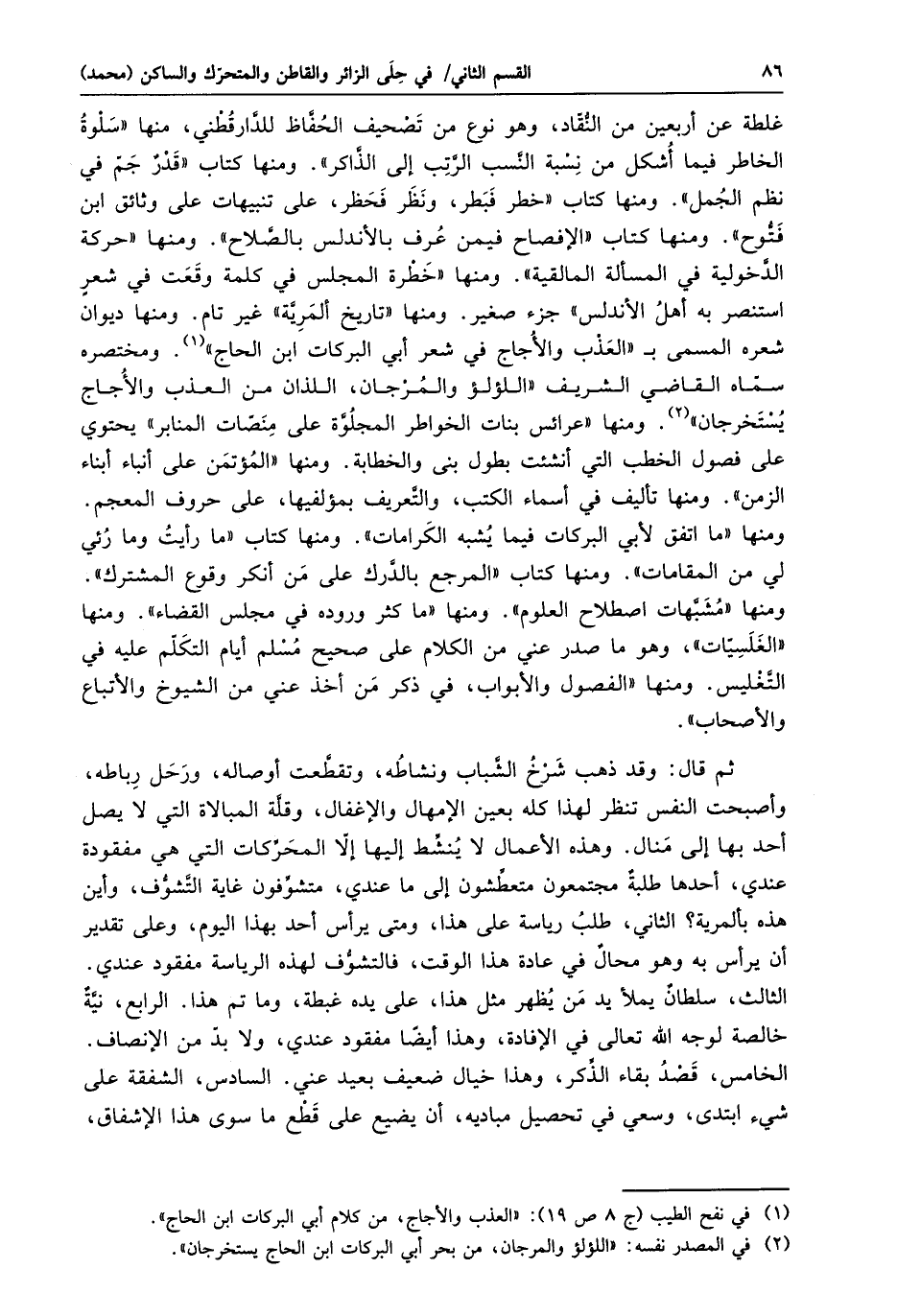 غلطة عن أربعين من النّقّاد، وهو نوع من تصحيف الحفّاظ للدّارقطني، منها «سلوة الخاطر فيما أشكل من نسبة النّسب الرّتب إلى الذّاكر» . ومنها كتاب «قدر جمّ في نظم الجمل» . ومنها كتاب «خطر فبطر، ونظر فحظر، على تنبيهات على وثائق ابن فتّوح» . ومنها كتاب «الإفصاح فيمن عرف بالأندلس بالصّلاح» . ومنها «حركة الدّخولية في المسألة المالقية» . ومنها «خطرة المجلس في كلمة وقعت في شعر استنصر به أهل الأندلس» جزء صغير. ومنها «تاريخ ألمريّة» غير تام. ومنها ديوان شعره المسمى ب «العذب والأجاج في شعر أبي البركات ابن الحاج» «1» . ومختصره سمّاه القاضي الشريف «اللؤلؤ والمرجان، اللذان من العذب والأجاج يستخرجان» «2» . ومنها «عرائس بنات الخواطر المجلوّة على منصّات المنابر» يحتوي على فصول الخطب التي أنشئت بطول بنى والخطابة. ومنها «المؤتمن على أنباء أبناء الزمن» . ومنها تأليف في أسماء الكتب، والتّعريف بمؤلفيها، على حروف المعجم.