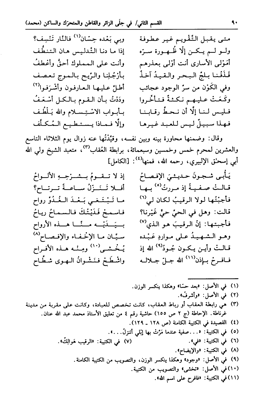 وقال: وضمنها محاورة بينه وبين نفسه، وقيّدتها عنه زوال يوم الثلاثاء التاسع والعشرين لمحرم خمس وخمسين وسبعمائة، برابطة العقاب «3» ، متعبد الشيخ ولي الله أبي إسحاق الإلبيري، رحمه الله، فمنها «4» : [الكامل]