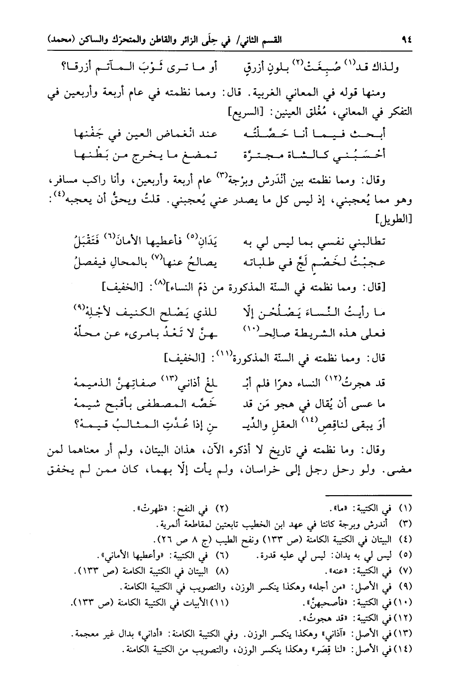 ومنها قوله في المعاني الغربية. قال: ومما نظمته في عام أربعة وأربعين في التفكر في المعاني، مغلق العينين: [السريع]