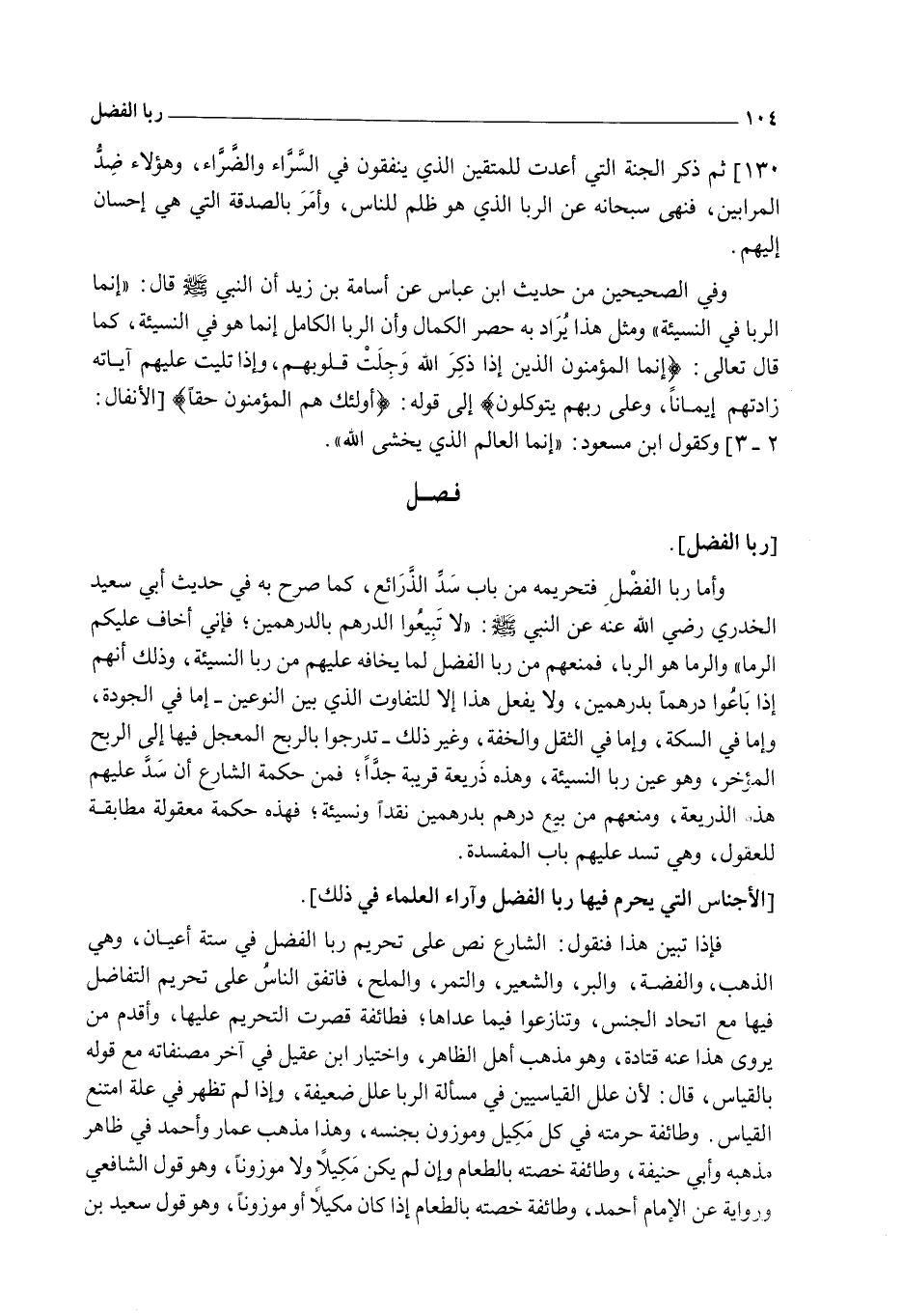 وَفِي الصَّحِيحَيْنِ مِنْ حَدِيثِ ابْنِ عَبَّاسٍ عَنْ أُسَامَةَ بْنِ زَيْدٍ أَنَّ النَّبِيَّ - صَلَّى اللَّهُ عَلَيْهِ وَسَلَّمَ - قَالَ: «إنَّمَا الرِّبَا فِي النَّسِيئَةِ» وَمِثْلُ هَذَا يُرَادُ بِهِ حَصْرُ الْكَمَالِ وَأَنَّ الرِّبَا الْكَامِلَ إنَّمَا هُوَ فِي النَّسِيئَةِ، كَمَا قَالَ تَعَالَى: {إِنَّمَا الْمُؤْمِنُونَ الَّذِينَ إِذَا ذُكِرَ اللَّهُ وَجِلَتْ قُلُوبُهُمْ وَإِذَا تُلِيَتْ عَلَيْهِمْ آيَاتُهُ زَادَتْهُمْ إِيمَانًا وَعَلَى رَبِّهِمْ يَتَوَكَّلُونَ} [الأنفال: 2] إلَى قَوْلِهِ: {أُولَئِكَ هُمُ الْمُؤْمِنُونَ حَقًّا} [الأنفال: 4] وَكَقَوْلِ ابْنِ مَسْعُودٍ: " إنَّمَا الْعَالِمُ الَّذِي يَخْشَى اللَّهَ ".