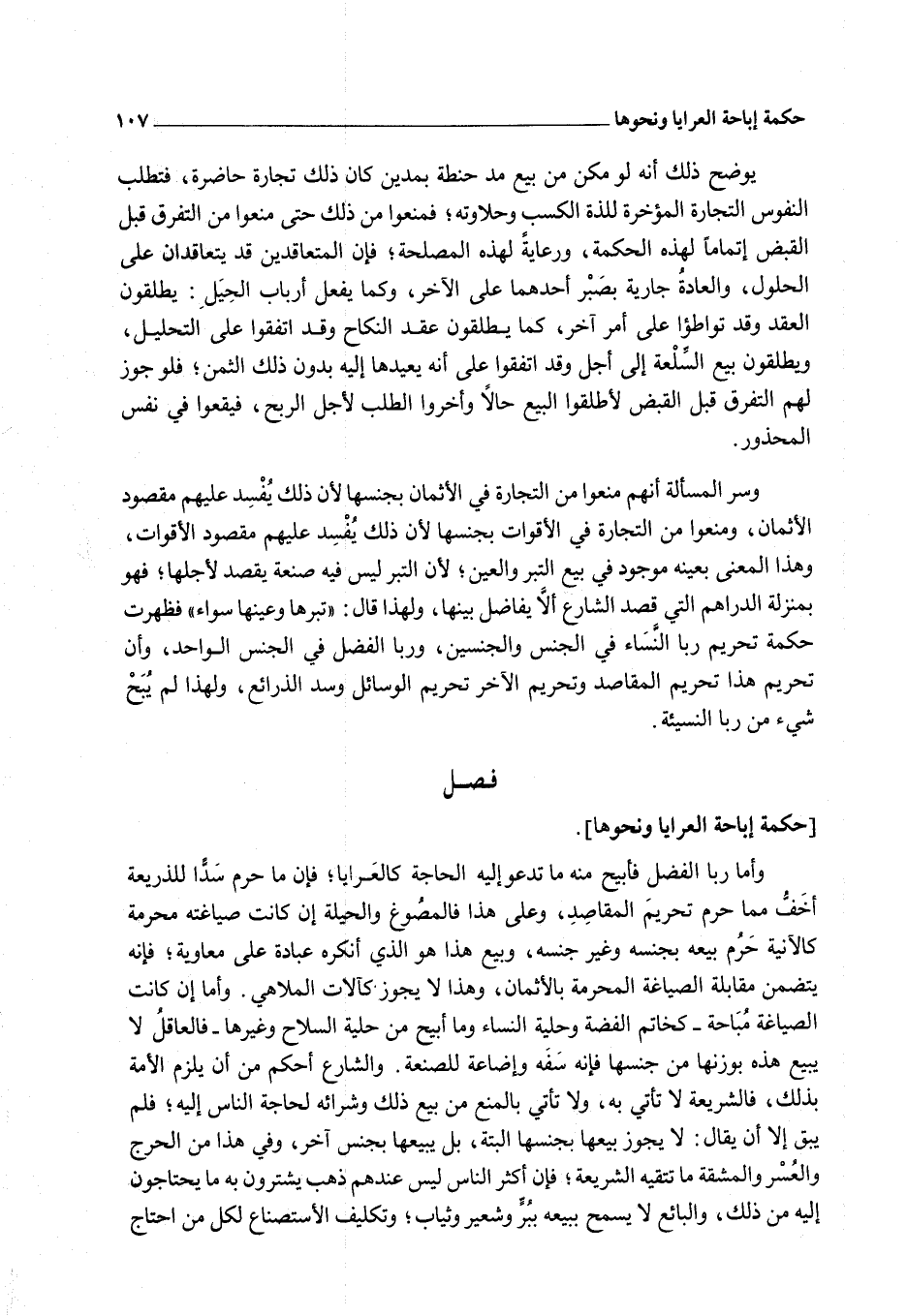 وَأَمَّا رِبَا الْفَضْلِ فَأُبِيحَ مِنْهُ مَا تَدْعُو إلَيْهِ الْحَاجَةُ كَالْعَرَايَا؛ فَإِنَّ مَا حُرِّمَ سَدًّا لِلذَّرِيعَةِ أَخَفُّ مِمَّا حَرَّمَ تَحْرِيمَ الْمَقَاصِدِ، وَعَلَى هَذَا فَالْمَصُوغُ وَالْحِيلَةُ إنْ كَانَتْ صِيَاغَتُهُ مُحَرَّمَةً كَالْآنِيَةِ حُرِّمَ بَيْعُهُ بِجِنْسِهِ وَغَيْرِ جِنْسِهِ، وَبَيْعُ هَذَا هُوَ الَّذِي أَنْكَرَهُ عُبَادَةُ عَلَى مُعَاوِيَةَ؛ فَإِنَّهُ يَتَضَمَّنُ مُقَابَلَةَ الصِّيَاغَةِ الْمُحَرَّمَةِ بِالْأَثْمَانِ، وَهَذَا لَا يَجُوزُ كَآلَاتِ الْمَلَاهِي. وَأَمَّا إنْ كَانَتْ الصِّيَاغَةُ مُبَاحَةً - كَخَاتَمِ الْفِضَّةِ وَحِلْيَةِ النِّسَاءِ وَمَا أُبِيحَ مِنْ حِلْيَةِ السِّلَاحِ وَغَيْرِهَا - فَالْعَاقِلُ لَا يَبِيعُ هَذِهِ بِوَزْنِهَا مِنْ جِنْسِهَا فَإِنَّهُ سَفَهٌ وَإِضَاعَةٌ لِلصَّنْعَةِ. وَالشَّارِعُ أَحْكَمُ مِنْ أَنْ يُلْزِمَ الْأُمَّةَ بِذَلِكَ، فَالشَّرِيعَةُ لَا تَأْتِي بِهِ، وَلَا تَأْتِي بِالْمَنْعِ مِنْ بَيْعِ ذَلِكَ وَشِرَائِهِ