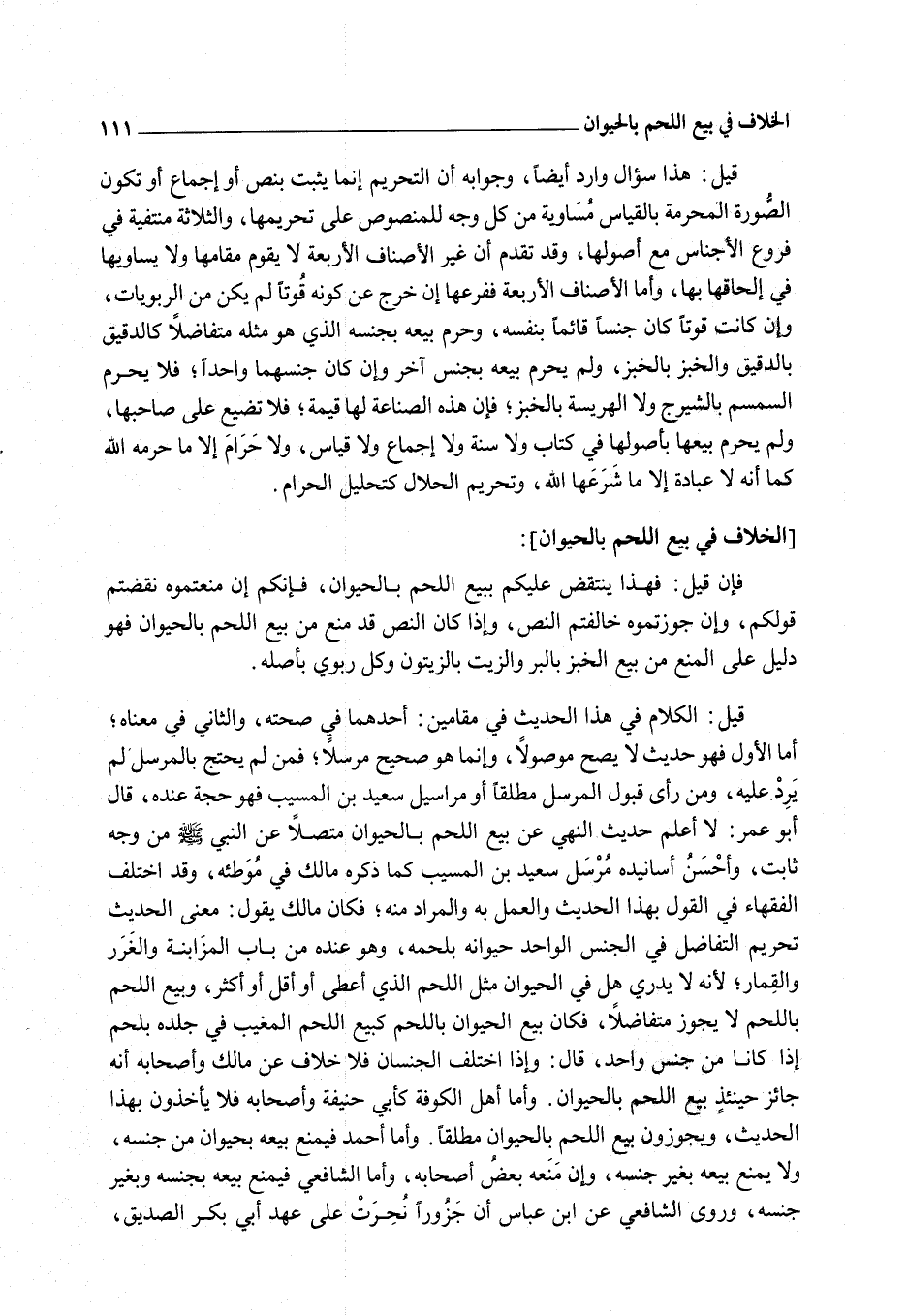 قِيلَ: الْكَلَامُ فِي هَذَا الْحَدِيثِ فِي مَقَامَيْنِ: أَحَدُهُمَا فِي صِحَّتِهِ، وَالثَّانِي فِي مَعْنَاهُ؛ أَمَّا الْأَوَّلُ فَهُوَ حَدِيثٌ لَا يَصِحُّ مَوْصُولًا، وَإِنَّمَا هُوَ صَحِيحٌ مُرْسَلًا؛ فَمَنْ لَمْ يَحْتَجَّ بِالْمُرْسَلِ لَمْ يَرُدَّ عَلَيْهِ، وَمَنْ رَأَى قَبُولَ الْمُرْسَلِ مُطْلَقًا أَوْ مَرَاسِيلِ سَعِيدِ بْنِ الْمُسَيِّبِ فَهُوَ حُجَّةٌ عِنْدَهُ، قَالَ أَبُو عُمَرَ: لَا أَعْلَمُ حَدِيثَ النَّهْيِ عَنْ بَيْعِ اللَّحْمِ بِالْحَيَوَانِ مُتَّصِلًا عَنْ النَّبِيِّ - صَلَّى اللَّهُ عَلَيْهِ وَسَلَّمَ - مِنْ وَجْهٍ ثَابِتٍ، وَأَحْسَنُ أَسَانِيدِهِ مُرْسَلُ سَعِيدِ بْنِ الْمُسَيِّبِ كَمَا ذَكَرَهُ مَالِكٌ فِي مُوَطَّئِهِ، وَقَدْ اخْتَلَفَ الْفُقَهَاءُ فِي الْقَوْلِ بِهَذَا الْحَدِيثِ وَالْعَمَلِ بِهِ وَالْمُرَادِ مِنْهُ؛ فَكَانَ مَالِكٌ يَقُولُ: مَعْنَى الْحَدِيثِ تَحْرِيمُ التَّفَاضُلِ فِي الْجِنْسِ الْوَاحِدِ حَيَوَانُهُ بِلَحْمِهِ، وَهُوَ عِنْدَهُ مِنْ بَابِ الْمُزَابَنَةِ وَالْغَرَرِ وَالْقِمَارِ؛ لِأَنَّهُ لَا يَدْرِي هَلْ فِي الْحَيَوَانِ مِثْلُ اللَّحْمِ الَّذِي أَعْطَى أَوْ أَقَلَّ أَوْ أَكْثَرَ، وَبَيْعُ اللَّحْمِ بِاللَّحْمِ لَا يَجُوزُ مُتَفَاضِلًا، فَكَانَ بَيْعُ الْحَيَوَانِ بِاللَّحْمِ كَبَيْعِ اللَّحْمِ الْمُغَيَّبِ فِي جِلْدِهِ بِلَحْمٍ إذَا كَانَا مِنْ جِنْسٍ وَاحِدٍ، قَالَ: وَإِذَا اخْتَلَفَ الْجِنْسَانِ فَلَا خِلَافَ عَنْ مَالِكٍ وَأَصْحَابِهِ أَنَّهُ جَائِزٌ حِينَئِذٍ بَيْعُ اللَّحْمِ بِالْحَيَوَانِ. وَأَمَّا أَهْلُ الْكُوفَةِ كَأَبِي حَنِيفَةَ وَأَصْحَابِهِ فَلَا يَأْخُذُونَ بِهَذَا الْحَدِيثِ، وَيُجَوِّزُونَ بَيْعَ اللَّحْمِ بِالْحَيَوَانِ مُطْلَقًا. وَأَمَّا أَحْمَدُ فَيَمْنَعُ بَيْعَهُ بِحَيَوَانٍ مِنْ جِنْسِهِ، وَلَا يَمْنَعُ بَيْعَهُ بِغَيْرِ جِنْسِهِ، وَإِنْ مَنَعَهُ بَعْضُ أَصْحَابِهِ، وَأَمَّا الشَّافِعِيُّ فَيَمْنَعُ بَيْعَهُ بِجِنْسِهِ وَبِغَيْرِ جِنْسِهِ، وَرَوَى الشَّافِعِيُّ عَنْ ابْنِ عَبَّاسٍ أَنَّ جَزُورًا نُحِرَتْ عَلَى عَهْدِ أَبِي بَكْرٍ الصِّدِّيقِ،