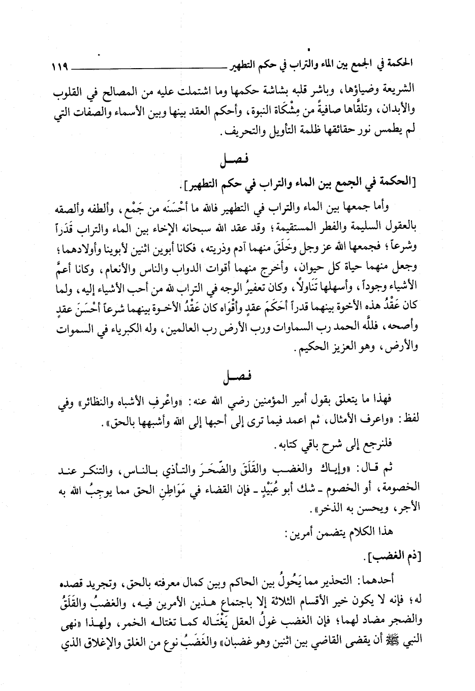 وَأَمَّا جَمْعُهَا بَيْنَ الْمَاءِ وَالتُّرَابِ فِي التَّطْهِيرِ فَاَللَّهِ مَا أَحْسَنَهُ مِنْ جَمْعٍ، وَأَلْطَفَهُ وَأَلْصَقَهُ بِالْعُقُولِ السَّلِيمَةِ وَالْفِطَرِ الْمُسْتَقِيمَةِ؛ وَقَدْ عَقَدَ اللَّهُ سُبْحَانَهُ الْإِخَاءَ بَيْنَ الْمَاءِ وَالتُّرَابِ قَدَرًا وَشَرْعًا؛ فَجَمَعَهَا اللَّهُ عَزَّ وَجَلَّ وَخَلَقَ مِنْهُمَا آدَمَ وَذُرِّيَّتَهُ، فَكَانَا أَبَوَيْنِ اثْنَيْنِ لِأَبَوَيْنَا وَأَوْلَادِهِمَا؛ وَجَعَلَ مِنْهُمَا حَيَاةَ كُلِّ حَيَوَانٍ، وَأَخْرَجَ مِنْهُمَا أَقْوَاتَ الدَّوَابِّ وَالنَّاسِ وَالْأَنْعَامِ، وَكَانَا أَعَمَّ الْأَشْيَاءِ وُجُودًا، وَأَسْهَلَهَا تَنَاوُلًا، وَكَانَ تَعْفِيرُ الْوَجْهِ فِي التُّرَابِ لِلَّهِ مِنْ أَحَبِّ الْأَشْيَاءِ إلَيْهِ، وَلَمَّا كَانَ عَقْدُ هَذِهِ الْأُخُوَّةِ بَيْنَهُمَا قَدَرًا أَحْكَمَ عَقْدٍ وَأَقْوَاهُ كَانَ عَقْدُ الْأُخُوَّةِ بَيْنَهُمَا شَرْعًا أَحْسَنَ عَقْدٍ وَأَصَحَّهُ، {فَلِلَّهِ الْحَمْدُ رَبِّ السَّمَاوَاتِ وَرَبِّ الأَرْضِ رَبِّ الْعَالَمِينَ} [الجاثية: 36] {وَلَهُ الْكِبْرِيَاءُ فِي السَّمَاوَاتِ وَالأَرْضِ وَهُوَ الْعَزِيزُ الْحَكِيمُ} [الجاثية: 37] .