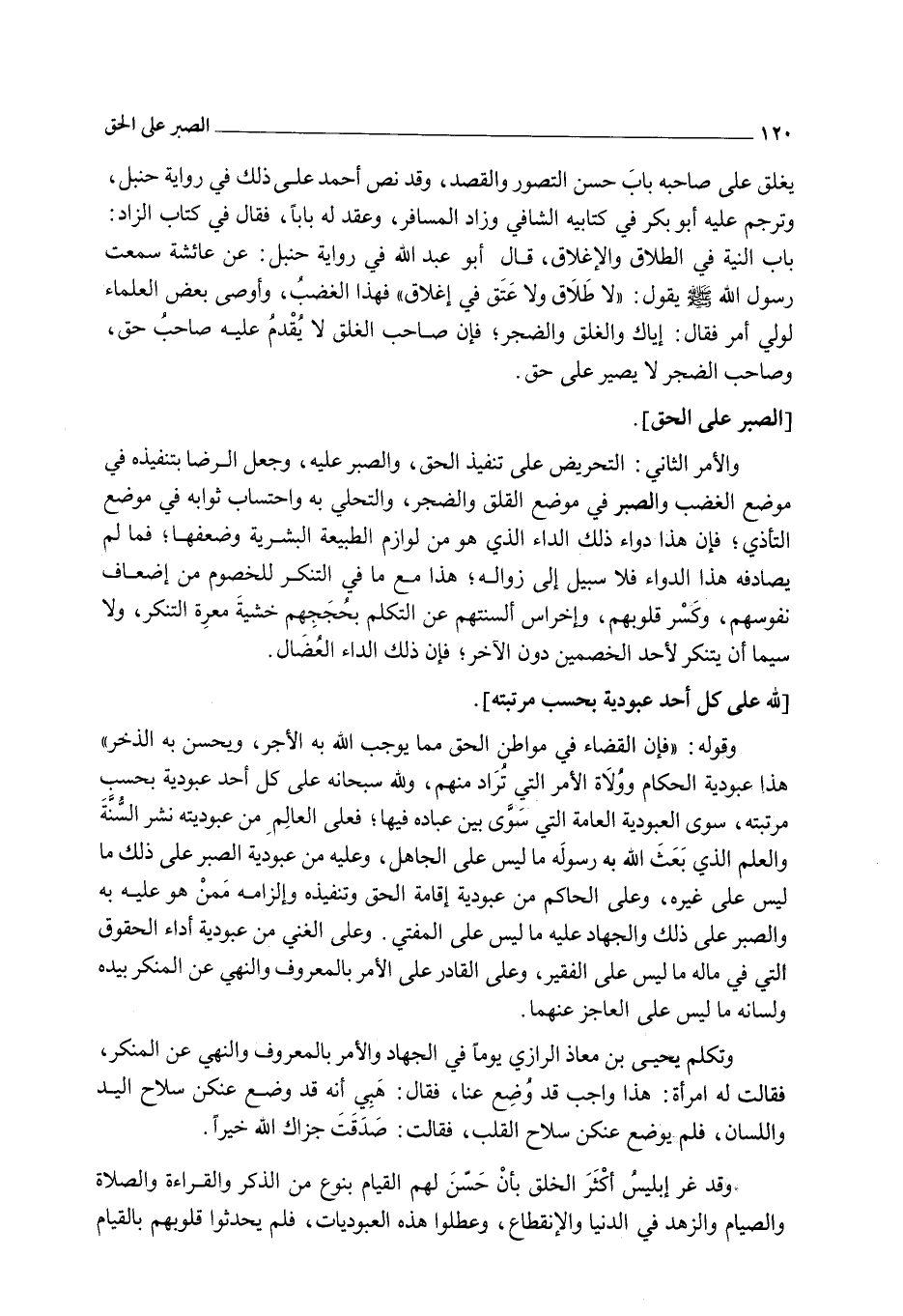 [الصَّبْرُ عَلَى الْحَقِّ] . وَالْأَمْرُ الثَّانِي: التَّحْرِيضُ عَلَى تَنْفِيذِ الْحَقِّ، وَالصَّبْرُ عَلَيْهِ، وَجَعْلِ الرِّضَا بِتَنْفِيذِهِ فِي مَوْضِعِ الْغَضَبِ وَالصَّبْرُ فِي مَوْضِعِ الْقَلَقِ وَالضَّجَرِ، وَالتَّحَلِّي بِهِ وَاحْتِسَابِ ثَوَابِهِ فِي مَوْضِعِ التَّأَذِّي؛ فَإِنَّ هَذَا دَوَاءُ ذَلِكَ الدَّاءِ الَّذِي هُوَ مِنْ لَوَازِمِ الطَّبِيعَةِ الْبَشَرِيَّةِ وَضَعْفِهَا؛ فَمَا لَمْ يُصَادِفْهُ هَذَا الدَّوَاءُ فَلَا سَبِيلَ إلَى زَوَالِهِ؛ هَذَا مَعَ مَا فِي التَّنَكُّرِ لِلْخُصُومِ مِنْ إضْعَافِ نُفُوسِهِمْ، وَكَسْرِ قُلُوبِهِمْ، وَإِخْرَاسِ أَلْسِنَتِهِمْ عَنْ التَّكَلُّمِ بِحُجَجِهِمْ خَشْيَةَ مَعَرَّةِ التَّنَكُّرِ، وَلَا سِيَّمَا أَنْ يَتَنَكَّرَ لِأَحَدِ الْخَصْمَيْنِ دُونَ الْآخَرِ؛ فَإِنَّ ذَلِكَ الدَّاءُ الْعُضَالُ.