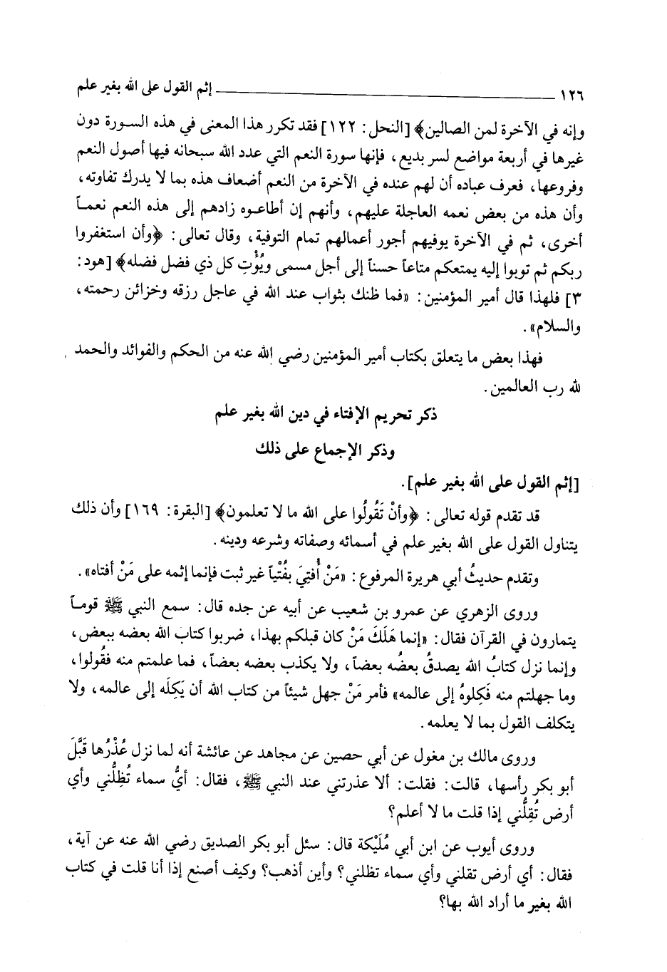 قَدْ تَقَدَّمَ قَوْله تَعَالَى: {وَأَنْ تَقُولُوا عَلَى اللَّهِ مَا لا تَعْلَمُونَ} [البقرة: 169] وَأَنَّ ذَلِكَ يَتَنَاوَلُ الْقَوْلَ عَلَى اللَّهِ بِغَيْرِ عِلْمٍ فِي أَسْمَائِهِ وَصِفَاتِهِ وَشَرْعِهِ وَدِينِهِ. وَتَقَدَّمَ حَدِيثُ أَبِي هُرَيْرَةَ الْمَرْفُوعُ: «مَنْ أُفْتِيَ بِفُتْيَا غَيْرِ ثَبْتٍ فَإِنَّمَا إثْمُهُ عَلَى مَنْ أَفْتَاهُ» .
