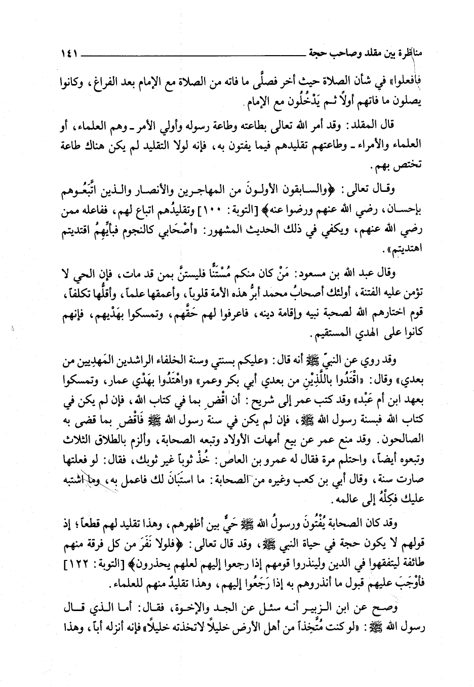 وَقَالَ تَعَالَى: {وَالسَّابِقُونَ الأَوَّلُونَ مِنَ الْمُهَاجِرِينَ وَالأَنْصَارِ وَالَّذِينَ اتَّبَعُوهُمْ بِإِحْسَانٍ رَضِيَ اللَّهُ عَنْهُمْ وَرَضُوا عَنْهُ} [التوبة: 100] وَتَقْلِيدُهُمْ اتِّبَاعٌ لَهُمْ، فَفَاعِلُهُ مِمَّنْ رَضِيَ اللَّهُ عَنْهُمْ، وَيَكْفِي فِي ذَلِكَ الْحَدِيثُ الْمَشْهُورُ: «أَصْحَابِي كَالنُّجُومِ فَبِأَيِّهِمْ اقْتَدَيْتُمْ اهْتَدَيْتُمْ» .
