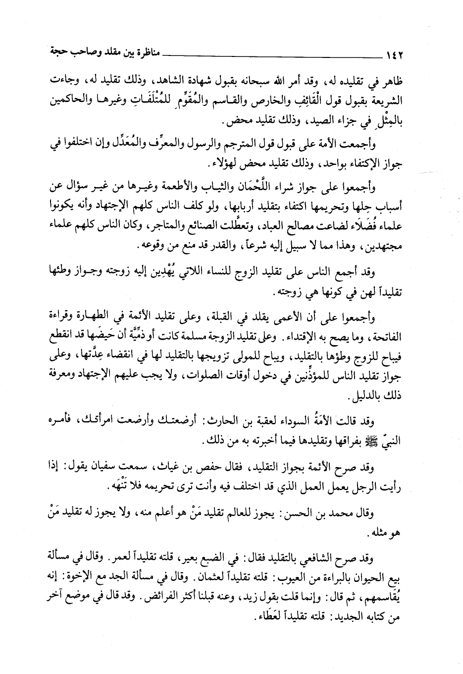 وَقَالَ مُحَمَّدُ بْنُ الْحَسَنِ: يَجُوزُ لِلْعَالِمِ تَقْلِيدُ مَنْ هُوَ أَعْلَمُ مِنْهُ، وَلَا يَجُوزُ لَهُ تَقْلِيدُ مَنْ هُوَ مِثْلُهُ. وَقَدْ صَرَّحَ الشَّافِعِيُّ بِالتَّقْلِيدِ فَقَالَ: فِي الضَّبُعِ بَعِيرٌ، قُلْته تَقْلِيدًا لِعُمَرَ. وَقَالَ فِي مَسْأَلَةِ بَيْعِ الْحَيَوَانِ بِالْبَرَاءَةِ مِنْ الْعُيُوبِ: قُلْته تَقْلِيدًا لِعُثْمَانَ. وَقَالَ فِي مَسْأَلَةِ الْجَدِّ مَعَ الْإِخْوَةِ: إنَّهُ يُقَاسِمُهُمْ، ثُمَّ قَالَ: وَإِنَّمَا قُلْت بِقَوْلِ زَيْدٍ، وَعَنْهُ قَبِلْنَا أَكْثَرَ الْفَرَائِضِ. وَقَدْ قَالَ فِي مَوْضِعٍ آخَرَ مِنْ كِتَابِهِ الْجَدِيدِ: قُلْته تَقْلِيدًا لِعَطَاءٍ.