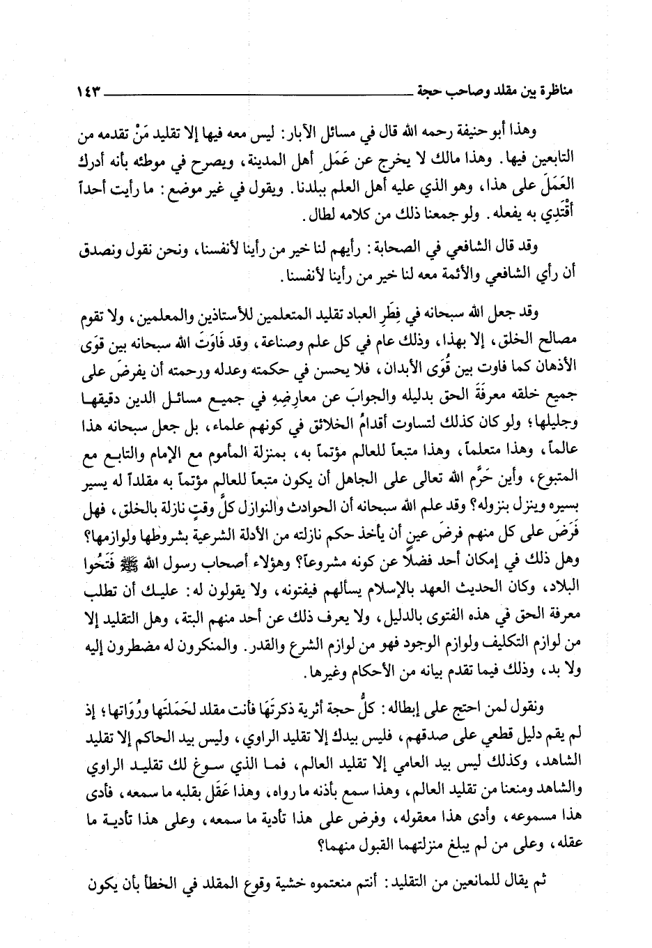 وَهَذَا أَبُو حَنِيفَةَ - رَحِمَهُ اللَّهُ - قَالَ فِي مَسَائِلِ الْآبَارِ: لَيْسَ مَعَهُ فِيهَا إلَّا تَقْلِيدُ مَنْ تَقَدَّمَهُ مِنْ التَّابِعِينَ فِيهَا. وَهَذَا مَالِكٌ لَا يَخْرُجُ عَنْ عَمَلِ أَهْلِ الْمَدِينَةِ، وَيُصَرِّحُ فِي مُوَطَّئِهِ بِأَنَّهُ أَدْرَكَ الْعَمَلَ عَلَى هَذَا، وَهُوَ الَّذِي عَلَيْهِ أَهْلُ الْعِلْمِ بِبَلَدِنَا. وَيَقُولُ فِي غَيْرِ مَوْضِعٍ: مَا رَأَيْت أَحَدًا أَقْتَدِي بِهِ يَفْعَلُهُ. وَلَوْ جَمَعْنَا ذَلِكَ مِنْ كَلَامِهِ لَطَالَ. وَقَدْ قَالَ الشَّافِعِيُّ فِي الصَّحَابَةِ: رَأْيُهُمْ لَنَا خَيْرٌ مِنْ رَأْيِنَا لِأَنْفُسِنَا، وَنَحْنُ نَقُولُ وَنُصَدِّقُ أَنَّ رَأْيَ الشَّافِعِيِّ وَالْأَئِمَّةِ مَعَهُ لَنَا خَيْرٌ مِنْ رَأْيِنَا لِأَنْفُسِنَا. وَقَدْ جَعَلَ اللَّهُ سُبْحَانَهُ فِي فِطَرِ الْعِبَادِ تَقْلِيدَ الْمُتَعَلِّمِينَ لِلْأُسْتَاذَيْنِ وَالْمُعَلِّمِينَ، وَلَا تَقُومُ مَصَالِحُ الْخَلْقِ، إلَّا بِهَذَا، وَذَلِكَ عَامٌّ فِي كُلِّ عِلْمٍ وَصِنَاعَةٍ، وَقَدْ فَاوَتَ اللَّهُ سُبْحَانَهُ بَيْنَ قُوَى الْأَذْهَانِ كَمَا فَاوَتَ بَيْنَ قُوَى الْأَبَدَانِ، فَلَا يُحْسَنُ فِي حِكْمَتِهِ وَعَدْلِهِ وَرَحْمَتِهِ أَنْ يَفْرِضَ عَلَى جَمِيعِ خَلْقِهِ مَعْرِفَةَ الْحَقِّ بِدَلِيلِهِ وَالْجَوَابَ عَنْ مُعَارِضِهِ فِي جَمِيعِ مَسَائِلِ الدِّينِ دَقِيقِهَا وَجَلِيلِهَا؛ وَلَوْ كَانَ كَذَلِكَ لَتَسَاوَتْ أَقْدَامُ الْخَلَائِقِ فِي كَوْنِهِمْ عُلَمَاءَ، بَلْ جَعَلَ سُبْحَانَهُ هَذَا عَالِمًا، وَهَذَا مُتَعَلِّمًا، وَهَذَا مُتَّبِعًا لِلْعَالِمِ مُؤْتَمًّا بِهِ، بِمَنْزِلَةِ الْمَأْمُومِ مَعَ الْإِمَامِ وَالتَّابِعِ مَعَ الْمَتْبُوعِ، وَأَيْنَ حَرَّمَ اللَّهُ تَعَالَى عَلَى الْجَاهِلِ أَنْ يَكُونَ مُتَّبِعًا لِلْعَالِمِ مُؤْتَمًّا بِهِ مُقَلِّدًا لَهُ يَسِيرُ بِسَيْرِهِ وَيَنْزِلُ بِنُزُولِهِ؟ وَقَدْ عَلِمَ اللَّهُ سُبْحَانَهُ أَنَّ الْحَوَادِثَ وَالنَّوَازِلَ كُلَّ وَقْتٍ نَازِلَةٌ بِالْخَلْقِ، فَهَلْ فَرَضَ عَلَى كُلٍّ مِنْهُمْ فَرْضَ عَيْنٍ أَنْ يَأْخُذَ حُكْمَ نَازِلَتِهِ مِنْ الْأَدِلَّةِ الشَّرْعِيَّةِ بِشُرُوطِهَا وَلَوَازِمِهَا؟ وَهَلْ ذَلِكَ فِي إمْكَانِ أَحَدٍ فَضْلًا عَنْ كَوْنِهِ مَشْرُوعًا؟ وَهَؤُلَاءِ أَصْحَابُ رَسُولِ اللَّهِ - صَلَّى اللَّهُ عَلَيْهِ وَسَلَّمَ - فَتَحُوا الْبِلَادَ، وَكَانَ الْحَدِيثُ الْعَهْدِ بِالْإِسْلَامِ يَسْأَلُهُمْ فَيُفْتُونَهُ، وَلَا يَقُولُونَ لَهُ: عَلَيْك أَنْ تَطْلُبَ مَعْرِفَةَ الْحَقِّ فِي هَذِهِ الْفَتْوَى بِالدَّلِيلِ، وَلَا يُعْرَفُ ذَلِكَ عَنْ أَحَدٍ مِنْهُمْ أَلْبَتَّةَ، وَهَلْ التَّقْلِيدُ إلَّا مِنْ لَوَازِمِ التَّكْلِيفِ وَلَوَازِمِ الْوُجُودِ فَهُوَ مِنْ لَوَازِمِ الشَّرْعِ وَالْقَدَرِ. وَالْمُنْكِرُونَ لَهُ مُضْطَرُّونَ إلَيْهِ وَلَا بُدَّ، وَذَلِكَ فِيمَا تَقَدَّمَ بَيَانُهُ مِنْ الْأَحْكَامِ وَغَيْرِهَا. وَنَقُولُ لِمَنْ احْتَجَّ عَلَى إبْطَالِهِ: كُلُّ حُجَّةٍ أَثَرِيَّةٍ ذَكَرْتهَا فَأَنْتَ مُقَلِّدٌ لِحَمَلَتِهَا وَرُوَاتِهَا؛ إذْ لَمْ يَقُمْ دَلِيلٌ قَطْعِيٌّ عَلَى صِدْقِهِمْ، فَلَيْسَ بِيَدِك إلَّا تَقْلِيدَ الرَّاوِي، وَلَيْسَ بِيَدِ الْحَاكِمِ إلَّا تَقْلِيدُ الشَّاهِدِ، وَكَذَلِكَ لَيْسَ بِيَدِ الْعَامِّيِّ إلَّا تَقْلِيدُ الْعَالِمِ، فَمَا الَّذِي سَوَّغَ لَك تَقْلِيدَ الرَّاوِي وَالشَّاهِدِ وَمَنْعَنَا مِنْ تَقْلِيدِ الْعَالِمِ، وَهَذَا سَمِعَ بِأُذُنِهِ مَا رَوَاهُ، وَهَذَا عَقَلَ بِقَلْبِهِ مَا سَمِعَهُ، فَأَدَّى هَذَا مَسْمُوعَهُ، وَأَدَّى هَذَا مَعْقُولَهُ، وَفُرِضَ عَلَى هَذَا تَأْدِيَةُ مَا سَمِعَهُ، وَعَلَى هَذَا تَأْدِيَةُ مَا عَ