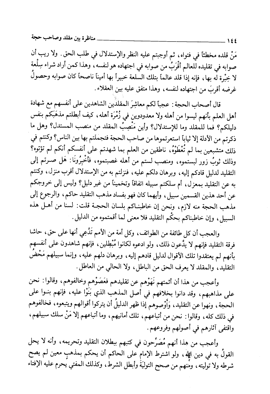 قَالَ أَصْحَابُ الْحُجَّةِ: عَجَبًا لَكُمْ مُعَاشِرَ الْمُقَلَّدِينَ الشَّاهِدِينَ عَلَى أَنْفُسِهِمْ مَعَ شَهَادَةِ أَهْلِ الْعِلْمِ بِأَنَّهُمْ لَيْسُوا مِنْ أَهْلِهِ وَلَا مَعْدُودِينَ فِي زُمْرَةِ أَهْلِهِ، كَيْفَ أَبْطَلْتُمْ مَذْهَبَكُمْ بِنَفْسِ دَلِيلِكُمْ؟ فَمَا لِلْمُقَلِّدِ وَمَا لِلِاسْتِدْلَالِ؟ وَأَيْنَ مَنْصِبُ الْمُقَلِّدِ مِنْ مَنْصِبِ الْمُسْتَدِلِّ؟ وَهَلْ مَا ذَكَرْتُمْ مِنْ الْأَدِلَّةِ إلَّا ثِيَابًا اسْتَعَرْتُمُوهَا مِنْ صَاحِبِ الْحُجَّةِ فَتَجَمَّلْتُمْ بِهَا بَيْنَ النَّاسِ؟ وَكُنْتُمْ فِي ذَلِكَ مُتَشَبِّعِينَ بِمَا لَمْ تُعْطُوهُ، نَاطِقِينَ مِنْ الْعِلْمِ بِمَا شَهِدْتُمْ عَلَى أَنْفُسِكُمْ أَنَّكُمْ لَمْ تُؤْتَوْهُ؟ وَذَلِكَ ثَوْبُ زُورٍ لَبِسْتُمُوهُ، وَمَنْصِبٌ لَسْتُمْ مِنْ أَهْلِهِ غَصَبْتُمُوهُ، فَأَخْبِرُونَا: هَلْ صِرْتُمْ إلَى التَّقْلِيدِ لِدَلِيلٍ قَادَكُمْ إلَيْهِ، وَبُرْهَانٍ دَلَّكُمْ عَلَيْهِ، فَنَزَلْتُمْ بِهِ مِنْ الِاسْتِدْلَالِ أَقْرَبَ مَنْزِلٍ، وَكُنْتُمْ بِهِ عَنْ التَّقْلِيدِ بِمَعْزِلٍ، أَمْ سَلَكْتُمْ سَبِيلَهُ اتِّفَاقًا وَتَخْمِينًا مِنْ غَيْرِ دَلِيلٍ؟ وَلَيْسَ إلَى خُرُوجِكُمْ عَنْ أَحَدِ هَذَيْنِ الْقِسْمَيْنِ سَبِيلٌ، وَأَيُّهُمَا كَانَ فَهُوَ بِفَسَادِ مَذْهَبِ التَّقْلِيدِ حَاكِمٌ، وَالرُّجُوعُ إلَى مَذْهَبِ الْحُجَّةِ مِنْهُ لَازِمٌ، وَنَحْنُ إنْ خَاطَبْنَاكُمْ بِلِسَانِ الْحُجَّةِ قُلْت: لَسْنَا مِنْ أَهْلِ هَذِهِ السَّبِيلِ، وَإِنْ خَاطَبْنَاكُمْ بِحُكْمِ التَّقْلِيدِ فَلَا مَعْنَى لِمَا أَقَمْتُمُوهُ مِنْ الدَّلِيلِ. وَالْعَجَبُ أَنَّ كُلَّ طَائِفَةٍ مِنْ الطَّوَائِفِ، وَكُلَّ أُمَّةٍ مِنْ الْأُمَمِ تَدَّعِي أَنَّهَا عَلَى حَقٍّ، حَاشَا فِرْقَةِ التَّقْلِيدِ فَإِنَّهُمْ لَا يَدَّعُونَ ذَلِكَ، وَلَوْ ادَّعَوْهُ لَكَانُوا مُبْطِلِينَ، فَإِنَّهُمْ شَاهِدُونَ عَلَى أَنْفُسِهِمْ بِأَنَّهُمْ لَمْ يَعْتَقِدُوا تِلْكَ الْأَقْوَالَ لِدَلِيلٍ قَادَهُمْ إلَيْهِ، وَبُرْهَانٌ دَلَّهُمْ عَلَيْهِ، وَإِنَّمَا سَبِيلُهُمْ مَحْضُ التَّقْلِيدِ، وَالْمُقَلِّدُ لَا يَعْرِفُ الْحَقَّ مِنْ الْبَاطِلِ، وَلَا الْحَالِيَّ مِنْ الْعَاطِلِ. وَأَعْجَبُ مِنْ هَذَا أَنَّ أَئِمَّتَهُمْ نَهَوْهُمْ عَنْ تَقْلِيدِهِمْ فَعَصَوْهُمْ وَخَالَفُوهُمْ، وَقَالُوا: نَحْنُ عَلَى مَذَاهِبِهِمْ، وَقَدْ دَانُوا بِخِلَافِهِمْ فِي أَصْلِ الْمَذْهَبِ الَّذِي بَنَوْا عَلَيْهِ، فَإِنَّهُمْ بَنَوْا عَلَى الْحُجَّةِ، وَنَهَوْا عَنْ التَّقْلِيدِ، وَأَوْصَوْهُمْ إذَا ظَهَرَ الدَّلِيلُ أَنْ يَتْرُكُوا أَقْوَالَهُمْ وَيَتَّبِعُوهُ، فَخَالَفُوهُمْ فِي ذَلِكَ كُلِّهِ، وَقَالُوا: نَحْنُ مِنْ أَتْبَاعِهِمْ، تِلْكَ أَمَانِيُّهُمْ، وَمَا أَتْبَاعُهُمْ إلَّا مَنْ سَلَكَ سَبِيلَهُمْ، وَاقْتَفَى آثَارَهُمْ فِي أُصُولِهِمْ وَفُرُوعِهِمْ.