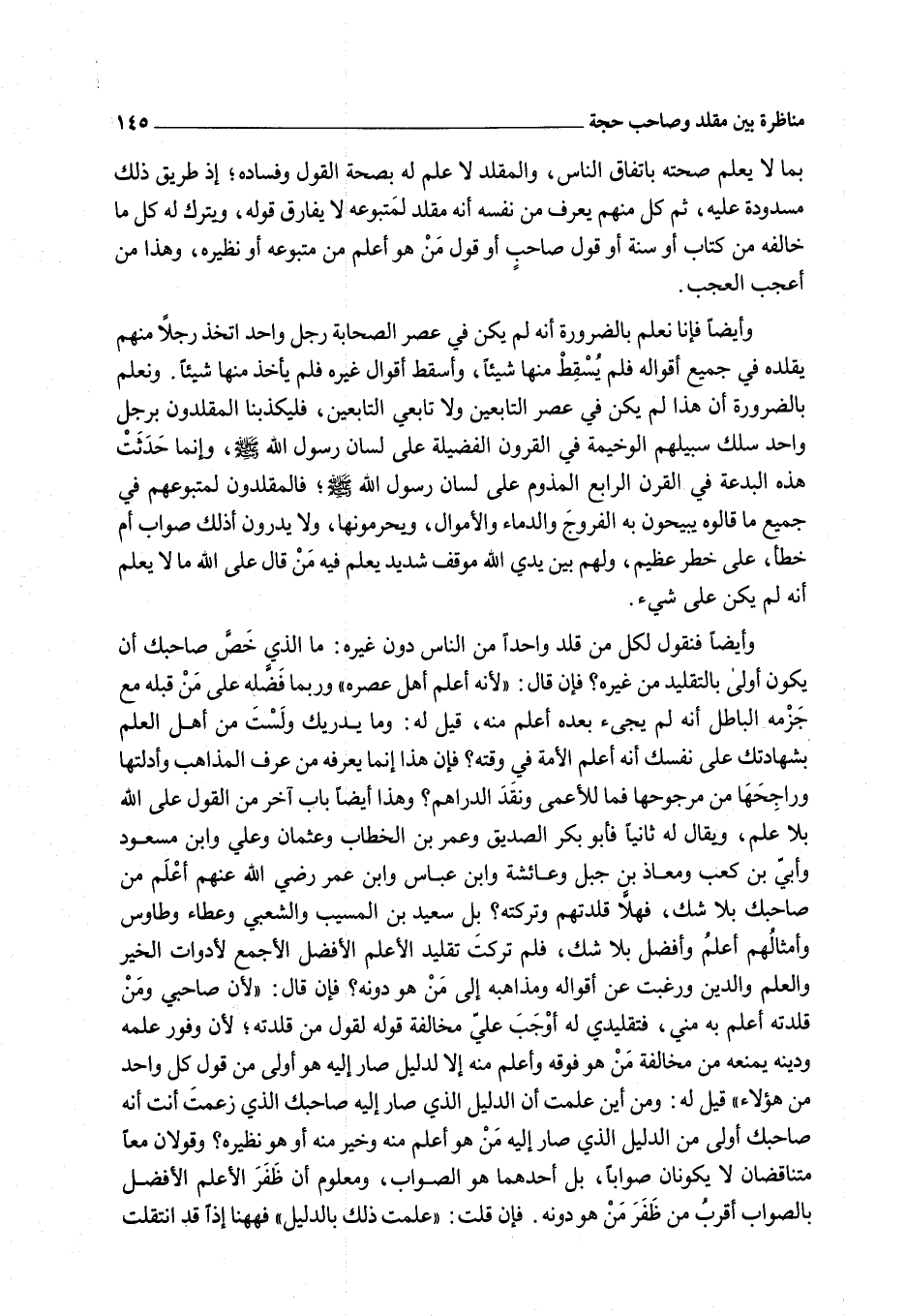 وَرُبَّمَا فَضَّلَهُ عَلَى مَنْ قَبْلَهُ مَعَ جَزْمِهِ الْبَاطِلِ أَنَّهُ لَمْ يَجِئْ بَعْدَهُ أَعْلَمُ مِنْهُ، قِيلَ لَهُ: وَمَا يُدْرِيك وَلَسْت مِنْ أَهْلِ الْعِلْمِ بِشَهَادَتِك عَلَى نَفْسِك أَنَّهُ أَعْلَمُ الْأُمَّةِ فِي وَقْتِهِ؟ فَإِنَّ هَذَا إنَّمَا يَعْرِفُهُ مَنْ عَرَفَ الْمَذَاهِبَ وَأَدِلَّتَهَا وَرَاجِحَهَا مِنْ مَرْجُوحِهَا فَمَا لِلْأَعْمَى وَنَقْدِ الدَّرَاهِمِ؟ ، وَهَذَا أَيْضًا بَابٌ آخَرُ مِنْ الْقَوْلِ عَلَى اللَّهِ بِلَا عِلْمٍ، وَيُقَالُ لَهُ ثَانِيًا فَأَبُو بَكْرٍ الصِّدِّيقُ وَعُمَرُ بْنُ الْخَطَّابِ وَعُثْمَانُ وَعَلِيٌّ وَابْنُ مَسْعُودٍ وَأُبَيُّ بْنُ كَعْبٍ وَمُعَاذُ بْنُ جَبَلٍ وَعَائِشَةُ وَابْنُ عَبَّاسٍ وَابْنُ عُمَرَ - رَضِيَ اللَّهُ عَنْهُمْ - أَعْلَمُ مِنْ صَاحِبِك بِلَا شَكٍّ، فَهَلَّا قَلَّدْتهمْ وَتَرَكْته؟ بَلْ سَعِيدُ بْنُ الْمُسَيِّبِ وَالشَّعْبِيُّ وَعَطَاءٌ وَطَاوُسٌ وَأَمْثَالُهُمْ أَعْلَمُ وَأَفْضَلُ بِلَا شَكٍّ، فَلِمَ تَرَكْتَ تَقْلِيدَ الْأَعْلَمِ الْأَفْضَلِ الْأَجْمَعِ لِأَدَوَاتِ الْخَيْرِ وَالْعِلْمِ وَالدِّينِ وَرَغِبْت عَنْ أَقْوَالِهِ وَمَذَاهِبِهِ إلَى مَنْ هُوَ دُونَهُ؟ فَإِنْ قَالَ: " لِأَنَّ صَاحِبِي وَمَنْ قَلَّدْته أَعْلَمُ بِهِ مِنِّي، فَتَقْلِيدِي لَهُ أَوْجَبَ عَلَيَّ مُخَالَفَةَ قَوْلِهِ لِقَوْلِ مَنْ قَلَّدْته؛ لِأَنَّ وُفُورَ عِلْمِهِ وَدِينِهِ يَمْنَعُهُ مِنْ مُخَالَفَةِ مَنْ هُوَ فَوْقَهُ وَأَعْلَمُ مِنْهُ إلَّا لِدَلِيلٍ صَارَ إلَيْهِ هُوَ أَوْلَى مِنْ قَوْلِ كُلِّ وَاحِدٍ مِنْ هَؤُلَاءِ " قِيلَ لَهُ: وَمِنْ أَيْنَ عَلِمْت أَنَّ الدَّلِيلَ الَّذِي صَارَ إلَيْهِ صَاحِبُك الَّذِي زَعَمْت أَنْتَ أَنَّهُ صَاحِبُك أَوْلَى مِنْ الدَّلِيلِ الَّذِي صَارَ إلَيْهِ مَنْ هُوَ أَعْلَمُ مِنْهُ وَخَيْرٌ مِنْهُ أَوْ هُوَ نَظِيرُهُ؟ وَقَوْلَانِ مَعًا مُتَنَاقِضَانِ لَا يَكُونَانِ صَوَابًا، بَلْ أَحَدُهُمَا هُوَ الصَّوَابُ، وَمَعْلُومٌ أَنَّ ظَفَرَ الْأَعْلَمِ الْأَفْضَلِ بِالصَّوَابِ أَقْرَبُ مِنْ ظَفَرِ مَنْ هُوَ دُونَهُ. فَإِنْ قُلْت: " عَلِمْت ذَلِكَ بِالدَّلِيلِ " فَهَهُنَا إذًا قَدْ انْتَقَلْت