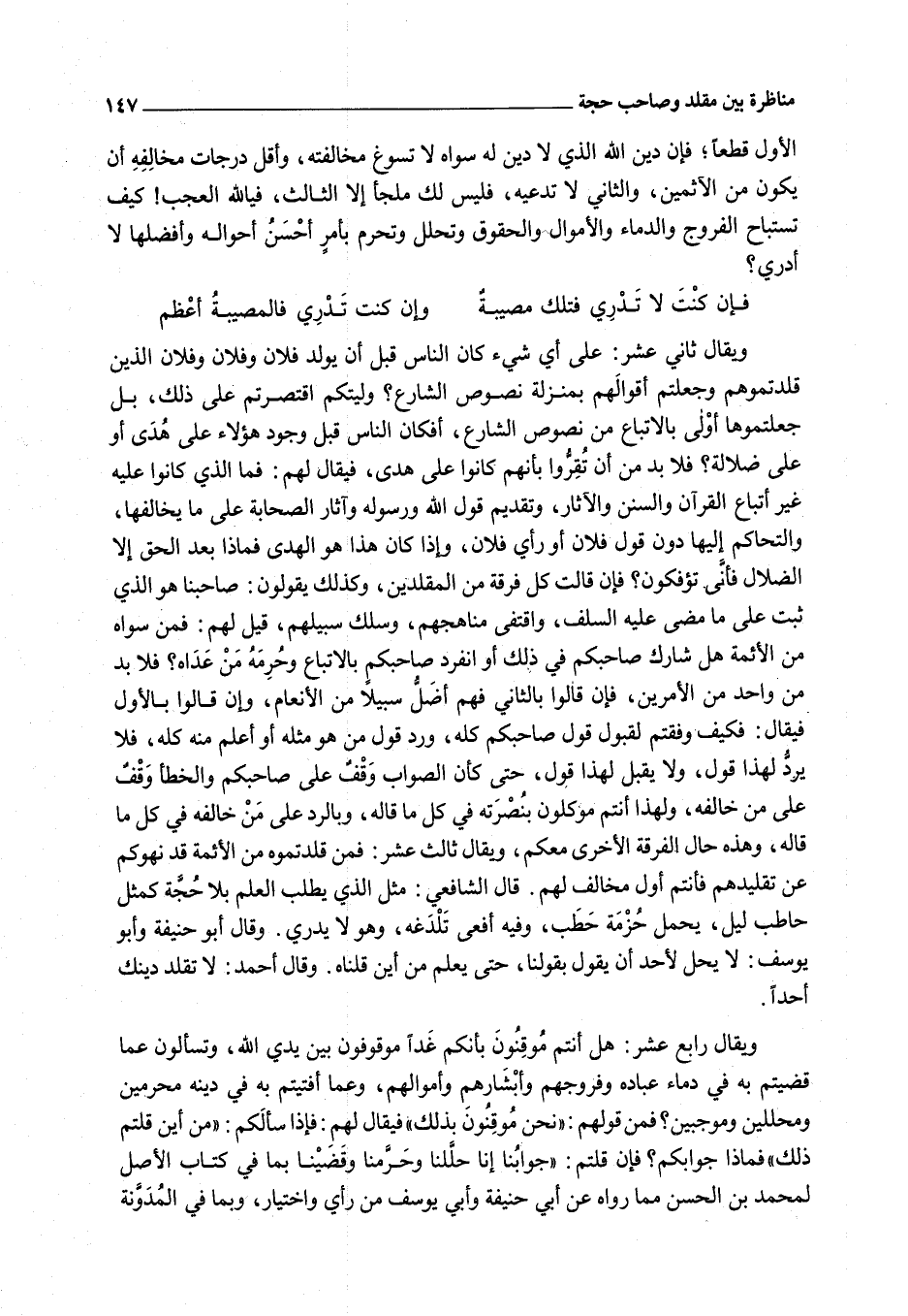 وَيُقَالُ ثَانِي عَشَرَ: عَلَى أَيِّ شَيْءٍ كَانَ النَّاسُ قَبْلَ أَنْ يُولَدَ فُلَانٌ وَفُلَانٌ وَفُلَانٌ الَّذِينَ قَلَّدْتُمُوهُمْ وَجَعَلْتُمْ أَقْوَالَهُمْ بِمَنْزِلَةِ نُصُوصِ الشَّارِعِ؟ وَلَيْتَكُمْ اقْتَصَرْتُمْ عَلَى ذَلِكَ، بَلْ جَعَلْتُمُوهَا أَوْلَى بِالِاتِّبَاعِ مِنْ نُصُوصِ الشَّارِعِ، أَفَكَانَ النَّاسُ قَبْلَ وُجُودِ هَؤُلَاءِ عَلَى هُدًى أَوْ عَلَى ضَلَالَةٍ؟ فَلَا بُدَّ مِنْ أَنْ تُقِرُّوا بِأَنَّهُمْ كَانُوا عَلَى هُدًى، فَيُقَالُ لَهُمْ: فَمَا الَّذِي كَانُوا عَلَيْهِ غَيْرُ اتِّبَاعِ الْقُرْآنِ وَالسُّنَنِ وَالْآثَارِ، وَتَقْدِيمِ قَوْلِ اللَّهِ وَرَسُولِهِ وَآثَارِ الصَّحَابَةِ عَلَى مَا يُخَالِفُهَا، وَالتَّحَاكُمِ إلَيْهَا دُونَ قَوْلِ فُلَانٍ أَوْ رَأْيِ فُلَانٍ، وَإِذَا كَانَ هَذَا هُوَ الْهُدَى فَمَاذَا بَعْدَ الْحَقِّ إلَّا الضَّلَالُ فَأَنَّى تُؤْفَكُونَ؟ فَإِنْ قَالَتْ كُلُّ فِرْقَةٍ مِنْ الْمُقَلِّدِينَ، وَكَذَلِكَ يَقُولُونَ: صَاحِبُنَا هُوَ الَّذِي ثَبَتَ عَلَى مَا مَضَى عَلَيْهِ السَّلَفُ، وَاقْتَفَى مَنَاهِجَهُمْ، وَسَلَكَ سَبِيلَهُمْ، قِيلَ لَهُمْ: فَمَنْ سِوَاهُ مِنْ الْأَئِمَّةِ هَلْ شَارَكَ صَاحِبَكُمْ فِي ذَلِكَ أَوْ انْفَرَدَ صَاحِبُكُمْ بِالِاتِّبَاعِ وَحُرِمَهُ مَنْ عَدَاهُ؟ فَلَا بُدَّ مِنْ وَاحِدٍ مِنْ الْأَمْرَيْنِ، فَإِنْ قَالُوا بِالثَّانِي فَهُمْ أَضَلُّ سَبِيلًا مِنْ الْأَنْعَامِ، وَإِنْ قَالُوا بِالْأَوَّلِ فَيُقَالُ: فَكَيْفَ وَفَّقْتُمْ لِقَبُولِ قَوْلِ صَاحِبِكُمْ كُلِّهِ، وَرَدِّ قَوْلِ مَنْ هُوَ مِثْلُهُ أَوْ أَعْلَمُ مِنْهُ كُلِّهِ، فَلَا يُرَدُّ لِهَذَا قَوْلٌ، وَلَا يُقْبَلُ لِهَذَا قَوْلٌ، حَتَّى كَأَنَّ الصَّوَابَ وَقْفٌ عَلَى صَاحِبِكُمْ وَالْخَطَأَ وَقْفٌ عَلَى مَنْ خَالَفَهُ، وَلِهَذَا أَنْتُمْ مُوَكَّلُونَ بِنُصْرَتِهِ فِي كُلِّ مَا قَالَهُ، وَبِالرَّدِّ عَلَى مَنْ خَالَفَهُ فِي كُلِّ مَا قَالَهُ، وَهَذِهِ حَالُ الْفِرْقَةِ الْأُخْرَى مَعَكُمْ.