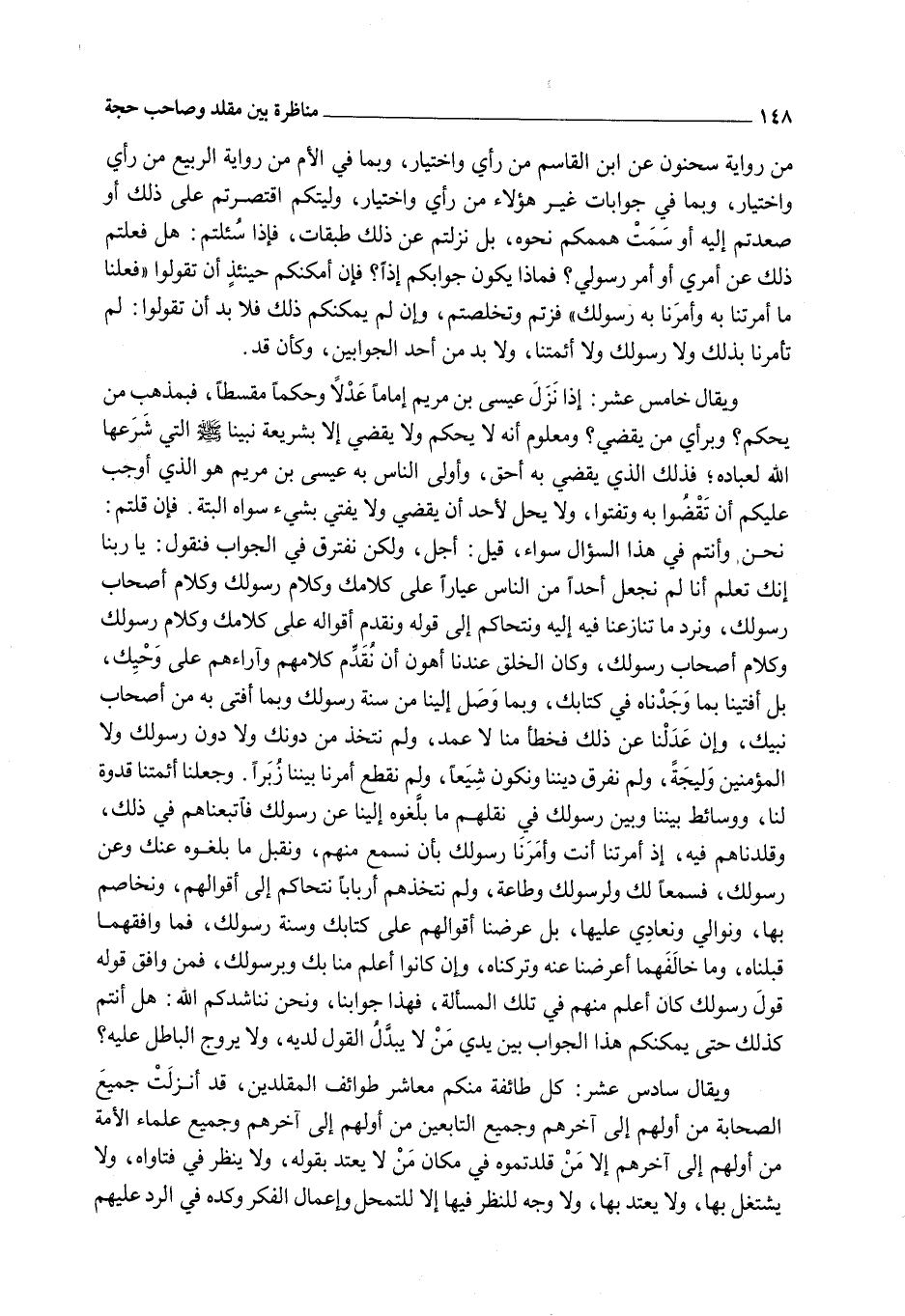 وَيُقَالُ خَامِسَ عَشَرَ: إذَا نَزَلَ عِيسَى ابْنُ مَرْيَمَ إمَامًا عَدْلًا وَحَكَمًا مُقْسِطًا، فَبِمَذْهَبِ مَنْ يَحْكُمُ؟ وَبِرَأْيِ مَنْ يَقْضِي؟ وَمَعْلُومٌ أَنَّهُ لَا يَحْكُمُ وَلَا يَقْضِي إلَّا بِشَرِيعَةِ نَبِيّنَا - صَلَّى اللَّهُ عَلَيْهِ وَسَلَّمَ - الَّتِي شَرَعَهَا اللَّهُ لِعِبَادِهِ؛ فَذَلِكَ الَّذِي يَقْضِي بِهِ أَحَقُّ، وَأَوْلَى النَّاسِ بِهِ عِيسَى ابْنُ مَرْيَمَ هُوَ الَّذِي أَوْجَبَ عَلَيْكُمْ أَنْ تَقْضُوا بِهِ وَتُفْتُوا، وَلَا يَحِلُّ لِأَحَدٍ أَنْ يَقْضِيَ وَلَا يُفْتِيَ بِشَيْءٍ سِوَاهُ أَلْبَتَّةَ. فَإِنْ قُلْتُمْ: نَحْنُ وَأَنْتُمْ فِي هَذَا السُّؤَالِ سَوَاءٌ، قِيلَ: أَجَلْ، وَلَكِنْ نَفْتَرِقُ فِي الْجَوَابِ فَنَقُولُ: يَا رَبَّنَا إنَّك تَعْلَمُ أَنَّا لَمْ نَجْعَلْ أَحَدًا مِنْ النَّاسِ عِيَارًا عَلَى كَلَامِك وَكَلَامِ رَسُولِك وَكَلَامِ أَصْحَابِ رَسُولِك، وَنَرُدُّ مَا تَنَازَعْنَا فِيهِ إلَيْهِ وَنَتَحَاكَمُ إلَى قَوْلِهِ وَنُقَدِّمُ أَقْوَالَهُ عَلَى كَلَامِك وَكَلَامِ رَسُولِك وَكَلَامِ أَصْحَابِ رَسُولِك، وَكَانَ الْخَلْقُ عِنْدَنَا أَهْوَنَ أَنْ نُقَدِّمَ كَلَامَهُمْ وَآرَاءَهُمْ عَلَى وَحْيِكَ، بَلْ أَفْتَيْنَا بِمَا وَجَدْنَاهُ فِي كِتَابِك، وَبِمَا وَصَلَ إلَيْنَا مِنْ سُنَّةِ رَسُولِك وَبِمَا أَفْتَى بِهِ مِنْ أَصْحَابِ نَبِيِّك، وَإِنْ عَدَلْنَا عَنْ ذَلِكَ فَخَطَأٌ مِنَّا لَا عَمْدٌ، وَلَمْ نَتَّخِذْ مِنْ دُونِك وَلَا دُونِ رَسُولِك وَلَا الْمُؤْمِنِينَ وَلِيجَةً، وَلَمْ نُفَرِّقْ دِينَنَا وَنَكُونُ شِيَعًا، وَلَمْ نُقَطِّعْ أَمْرَنَا بَيْنَنَا زُبُرًا. وَجَعَلْنَا أَئِمَّتَنَا قُدْوَةً لَنَا، وَوَسَائِطَ بَيْنَنَا وَبَيْنَ رَسُولِك فِي نَقْلِهِمْ مَا بَلَّغُوهُ إلَيْنَا عَنْ رَسُولِك فَاتَّبَعْنَاهُمْ فِي ذَلِكَ، وَقَلَّدْنَاهُمْ فِيهِ، إذْ أَمَرْتَنَا أَنْتَ وَأَمَرَنَا رَسُولُك بِأَنْ نَسْمَعَ مِنْهُمْ، وَنَقْبَلَ مَا بَلَّغُوهُ عَنْك وَعَنْ رَسُولِك، فَسَمْعًا لَك وَلِرَسُولِك وَطَاعَةً، وَلَمْ نَتَّخِذْهُمْ أَرْبَابًا نَتَحَاكَمُ إلَى أَقْوَالِهِمْ، وَنُخَاصِمُ بِهَا، وَنُوَالِي وَنُعَادِي عَلَيْهَا، بَلْ عَرَضْنَا أَقْوَالَهُمْ عَلَى كِتَابِك وَسُنَّةِ رَسُولِك، فَمَا وَافَقَهُمَا قَبِلْنَاهُ، وَمَا خَالَفَهُمَا أَعْرَضْنَا عَنْهُ وَتَرَكْنَاهُ، وَإِنْ كَانُوا أَعْلَمَ مِنَّا بِك وَبِرَسُولِك، فَمَنْ وَافَقَ قَوْلُهُ قَوْلَ رَسُولِك كَانَ أَعْلَمَ مِنْهُمْ فِي تِلْكَ الْمَسْأَلَةِ، فَهَذَا جَوَابُنَا، وَنَحْنُ نُنَاشِدُكُمْ اللَّهَ: هَلْ أَنْتُمْ كَذَلِكَ حَتَّى يُمْكِنُكُمْ هَذَا الْجَوَابُ بَيْنَ يَدَيْ مَنْ لَا يُبَدَّلُ الْقَوْلُ لَدَيْهِ، وَلَا يَرُوجُ الْبَاطِلُ عَلَيْهِ؟