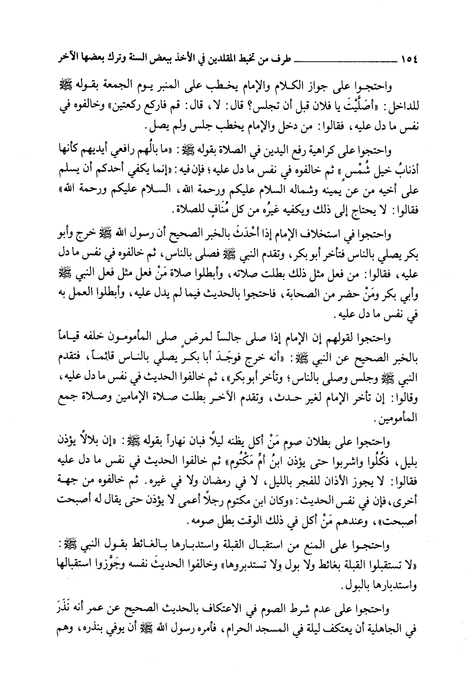 وَاحْتَجُّوا عَلَى جَوَازِ الْكَلَامِ وَالْإِمَامُ يَخْطُبُ عَلَى الْمِنْبَرِ يَوْمَ الْجُمُعَةِ «بِقَوْلِهِ - صَلَّى اللَّهُ عَلَيْهِ وَسَلَّمَ - لِلدَّاخِلِ: أَصَلَّيْت يَا فُلَانٌ قَبْلَ أَنْ تَجْلِسَ؟ قَالَ: لَا، قَالَ: قُمْ فَارْكَعْ رَكْعَتَيْنِ» وَخَالَفُوهُ فِي نَفْسِ مَا دَلَّ عَلَيْهِ، فَقَالُوا: مَنْ دَخَلَ وَالْإِمَامُ يَخْطُبُ جَلَسَ وَلَمْ يُصَلِّ. وَاحْتَجُّوا عَلَى كَرَاهِيَةِ رَفْعِ الْيَدَيْنِ فِي الصَّلَاةِ بِقَوْلِهِ - صَلَّى اللَّهُ عَلَيْهِ وَسَلَّمَ -: «مَا بَالُهُمْ رَافِعِي أَيْدِيهِمْ كَأَنَّهَا أَذْنَابُ خَيْلٍ شُمُسٍ» ثُمَّ خَالَفُوهُ فِي نَفْسِ مَا دَلَّ عَلَيْهِ؛ فَإِنَّ فِيهِ: «إنَّمَا يَكْفِي أَحَدَكُمْ أَنْ يُسَلِّمَ عَلَى أَخِيهِ مِنْ عَنْ يَمِينِهِ وَشِمَالِهِ السَّلَامُ عَلَيْكُمْ وَرَحْمَةُ اللَّهِ، السَّلَامُ عَلَيْكُمْ وَرَحْمَةُ اللَّهِ» فَقَالُوا: لَا يَحْتَاجُ إلَى ذَلِكَ وَيَكْفِيه غَيْرُهُ مِنْ كُلِّ مُنَافٍ لِلصَّلَاةِ.