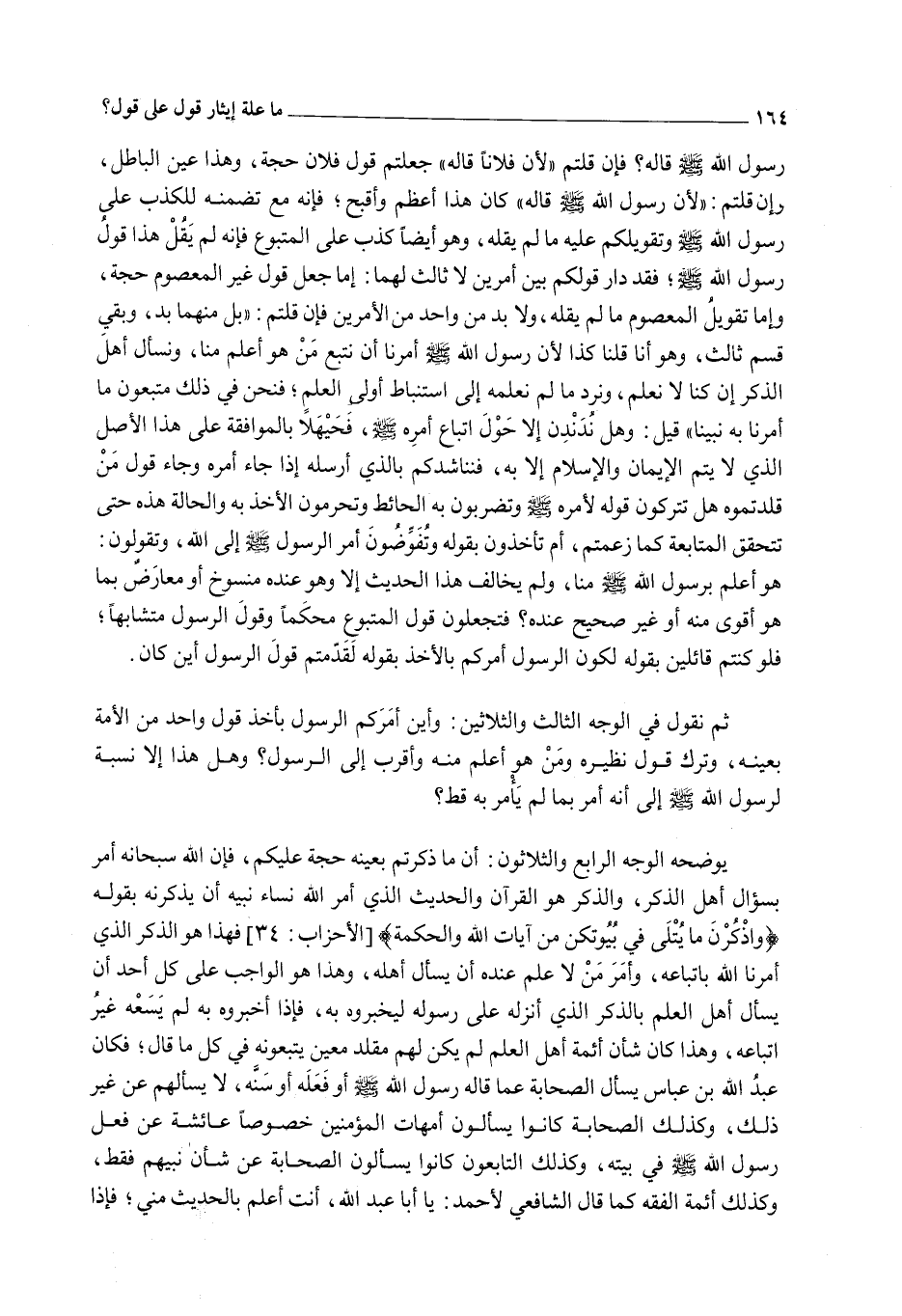 ثُمَّ نَقُولُ فِي الْوَجْهِ الثَّالِثِ وَالثَّلَاثِينَ: وَأَيْنَ أَمَرَكُمْ الرَّسُولُ بِأَخْذِ قَوْلِ وَاحِدٍ مِنْ الْأُمَّةِ بِعَيْنِهِ، وَتَرْكِ قَوْلِ نَظِيرِهِ وَمَنْ هُوَ أَعْلَمُ مِنْهُ وَأَقْرَبُ إلَى الرَّسُولِ؟ وَهَلْ هَذَا إلَّا نِسْبَةٌ لِرَسُولِ اللَّهِ - صَلَّى اللَّهُ عَلَيْهِ وَسَلَّمَ - إلَى أَنَّهُ أَمَرَ بِمَا لَمْ يَأْمُرْ بِهِ قَطُّ؟ يُوَضِّحُهُ الْوَجْهُ الرَّابِعُ وَالثَّلَاثُونَ: أَنَّ مَا ذَكَرْتُمْ بِعَيْنِهِ حُجَّةٌ عَلَيْكُمْ، فَإِنَّ اللَّهَ سُبْحَانَهُ أَمَرَ بِسُؤَالِ أَهْلِ الذِّكْرِ، وَالذِّكْرُ هُوَ الْقُرْآنُ وَالْحَدِيثُ الَّذِي أَمَرَ اللَّهُ نِسَاءَ نَبِيِّهِ أَنْ يَذْكُرْنَهُ بِقَوْلِهِ {وَاذْكُرْنَ مَا يُتْلَى فِي بُيُوتِكُنَّ مِنْ آيَاتِ اللَّهِ وَالْحِكْمَةِ} [الأحزاب: 34] فَهَذَا هُوَ الذِّكْرُ الَّذِي أَمَرَنَا اللَّهُ بِاتِّبَاعِهِ، وَأَمَرَ مَنْ لَا عِلْمَ عِنْدَهُ أَنْ يَسْأَلَ أَهْلَهُ، وَهَذَا هُوَ الْوَاجِبُ عَلَى كُلِّ أَحَدٍ أَنْ يَسْأَلَ أَهْلَ الْعِلْمِ بِالذِّكْرِ الَّذِي أَنْزَلَهُ عَلَى رَسُولِهِ لِيُخْبِرُوهُ بِهِ، فَإِذَا أَخْبَرُوهُ بِهِ لَمْ يَسَعْهُ غَيْرُ اتِّبَاعِهِ، وَهَذَا كَانَ شَأْنُ أَئِمَّةِ أَهْلِ الْعِلْمِ لَمْ يَكُنْ لَهُمْ مُقَلَّدٌ مُعَيَّنٌ يَتْبَعُونَهُ فِي كُلِّ مَا قَالَ؛ فَكَانَ عَبْدُ اللَّهِ بْنُ عَبَّاسٍ يَسْأَلُ الصَّحَابَةَ عَمَّا قَالَهُ رَسُولُ اللَّهِ - صَلَّى اللَّهُ عَلَيْهِ وَسَلَّمَ - أَوْ فَعَلَهُ أَوْ سَنَّهُ، لَا يَسْأَلُهُمْ عَنْ غَيْرِ ذَلِكَ، وَكَذَلِكَ الصَّحَابَةُ كَانُوا يَسْأَلُونَ أُمَّهَاتِ الْمُؤْمِنِينَ خُصُوصًا عَائِشَةَ عَنْ فِعْلِ رَسُولِ اللَّهِ - صَلَّى اللَّهُ عَلَيْهِ وَسَلَّمَ - فِي بَيْتِهِ، وَكَذَلِكَ التَّابِعُونَ كَانُوا يَسْأَلُونَ الصَّحَابَةَ عَنْ شَأْنِ نَبِيِّهِمْ فَقَطْ، وَكَذَلِكَ أَئِمَّةُ الْفِقْهِ كَمَا قَالَ الشَّافِعِيُّ لِأَحْمَدَ: يَا أَبَا عَبْدِ اللَّهِ، أَنْتَ أَعْلَمُ بِالْحَدِيثِ مِنِّي؛ فَإِذَا