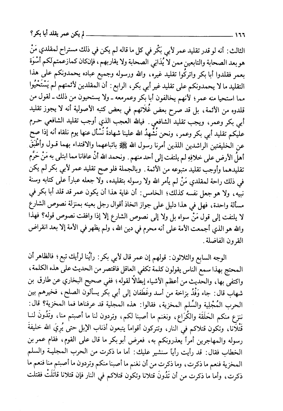 الثَّالِثُ: أَنَّهُ لَوْ قُدِّرَ تَقْلِيدُ عُمَرَ لِأَبِي بَكْرٍ فِي كُلِّ مَا قَالَهُ لَمْ يَكُنْ فِي ذَلِكَ مُسْتَرَاحٌ لِمُقَلِّدِي مَنْ هُوَ بَعْدَ الصَّحَابَةِ وَالتَّابِعِينَ مِمَّنْ لَا يُدَانِي الصَّحَابَةَ وَلَا يُقَارِبُهُمْ، فَإِنْ كَانَ كَمَا زَعَمْتُمْ لَكُمْ أُسْوَةٌ بِعُمَرَ فَقَلِّدُوا أَبَا بَكْرٍ وَاتْرُكُوا تَقْلِيدَ غَيْرِهِ، وَاَللَّهُ وَرَسُولُهُ وَجَمِيعُ عِبَادِهِ يَحْمَدُونَكُمْ عَلَى هَذَا التَّقْلِيدِ مَا لَا يَحْمَدُونَكُمْ عَلَى تَقْلِيدِ غَيْرِ أَبِي بَكْرٍ.