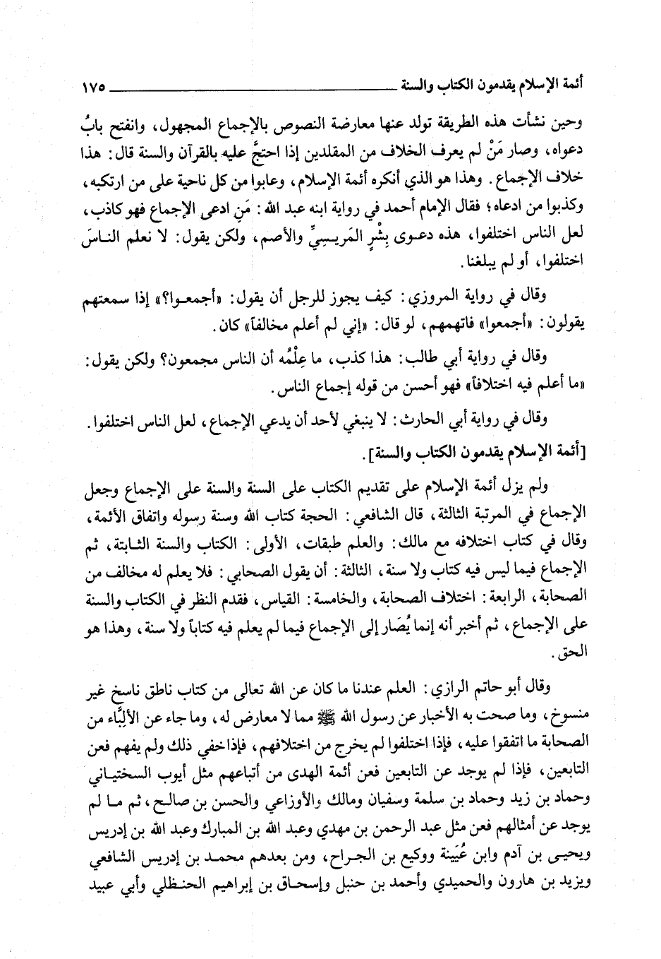 وَلَمْ يَزُلْ أَئِمَّةُ الْإِسْلَامِ عَلَى تَقْدِيمِ الْكِتَابِ عَلَى السُّنَّةِ، وَالسُّنَّةِ عَلَى الْإِجْمَاعِ وَجَعْلِ الْإِجْمَاعِ فِي الْمَرْتَبَةِ الثَّالِثَةِ، قَالَ الشَّافِعِيُّ: الْحُجَّةُ كِتَابُ اللَّهِ وَسُنَّةُ رَسُولِهِ وَاتِّفَاقُ الْأَئِمَّةُ.