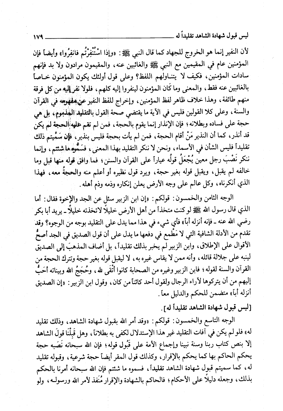 لِأَنَّ النَّفِيرَ إنَّمَا هُوَ الْخُرُوجُ لِلْجِهَادِ كَمَا قَالَ النَّبِيُّ - صَلَّى اللَّهُ عَلَيْهِ وَسَلَّمَ -: «وَإِذَا اسْتَنْفَرْتُمْ فَانْفِرُوا» وَأَيْضًا فَإِنَّ الْمُؤْمِنِينَ عَامٌّ فِي الْمُقِيمِينَ مَعَ النَّبِيِّ - صَلَّى اللَّهُ عَلَيْهِ وَسَلَّمَ - وَالْغَائِبِينَ عَنْهُ، وَالْمُقِيمُونَ مُرَادُونَ وَلَا بُدَّ فَإِنَّهُمْ سَادَاتُ الْمُؤْمِنِينَ، فَكَيْفَ لَا يَتَنَاوَلُهُمْ اللَّفْظُ؟ وَعَلَى قَوْلِ أُولَئِكَ يَكُونُ الْمُؤْمِنُونَ خَاصًّا بِالْغَائِبِينَ عَنْهُ فَقَطْ، وَالْمَعْنَى " وَمَا كَانَ الْمُؤْمِنُونَ لِيَنْفِرُوا إلَيْهِ كُلُّهُمْ، فَلَوْلَا نَفَرَ إلَيْهِ مِنْ كُلِّ فِرْقَةٍ مِنْهُمْ طَائِفَةٌ " وَهَذَا خِلَافُ ظَاهِرِ لَفْظِ الْمُؤْمِنِينَ، وَإِخْرَاجٌ لِلَفْظِ النَّفِيرِ عَنْ مَفْهُومِهِ فِي الْقُرْآنِ وَالسُّنَّةِ، وَعَلَى كِلَا الْقَوْلَيْنِ فَلَيْسَ فِي الْآيَةِ مَا يَقْتَضِي صِحَّةَ الْقَوْلِ بِالتَّقْلِيدِ الْمَذْمُومِ، بَلْ هِيَ حُجَّةٌ عَلَى فَسَادِهِ وَبُطْلَانِهِ؛ فَإِنَّ الْإِنْذَارَ إنَّمَا يَقُومُ بِالْحُجَّةِ، فَمَنْ لَمْ تَقُمْ عَلَيْهِ الْحُجَّةُ لَمْ يَكُنْ قَدْ أُنْذِرَ، كَمَا أَنَّ النَّذِيرَ مَنْ أَقَامَ الْحُجَّةَ، فَمَنْ لَمْ يَأْتِ بِحُجَّةٍ فَلَيْسَ بِنَذِيرٍ، فَإِنْ سَمَّيْتُمْ ذَلِكَ تَقْلِيدًا فَلَيْسَ الشَّأْنُ فِي الْأَسْمَاءِ، وَنَحْنُ لَا نُنْكِرُ التَّقْلِيدَ بِهَذَا الْمَعْنَى، فَسَمُّوهُ مَا شِئْتُمْ، وَإِنَّمَا نُنْكِرُ نَصْبَ رَجُلٍ مُعَيَّنٍ يُجْعَلُ قَوْلُهُ عِيَارًا عَلَى الْقُرْآنِ وَالسُّنَنِ؛ فَمَا وَافَقَ قَوْلَهُ مِنْهَا قُبِلَ وَمَا خَالَفَهُ لَمْ يُقْبَلْ، وَيُقْبَلُ قَوْلُهُ بِغَيْرِ حُجَّةٍ، وَيُرَدُّ قَوْلُ نَظِيرِهِ أَوْ أَعْلَمَ مِنْهُ وَالْحُجَّةُ مَعَهُ، فَهَذَا الَّذِي أَنْكَرْنَاهُ، وَكُلُّ عَالِمٍ عَلَى وَجْهِ الْأَرْضِ يُعْلِنُ إنْكَارَهُ وَذَمَّهُ وَذَمَّ أَهْلِهِ.