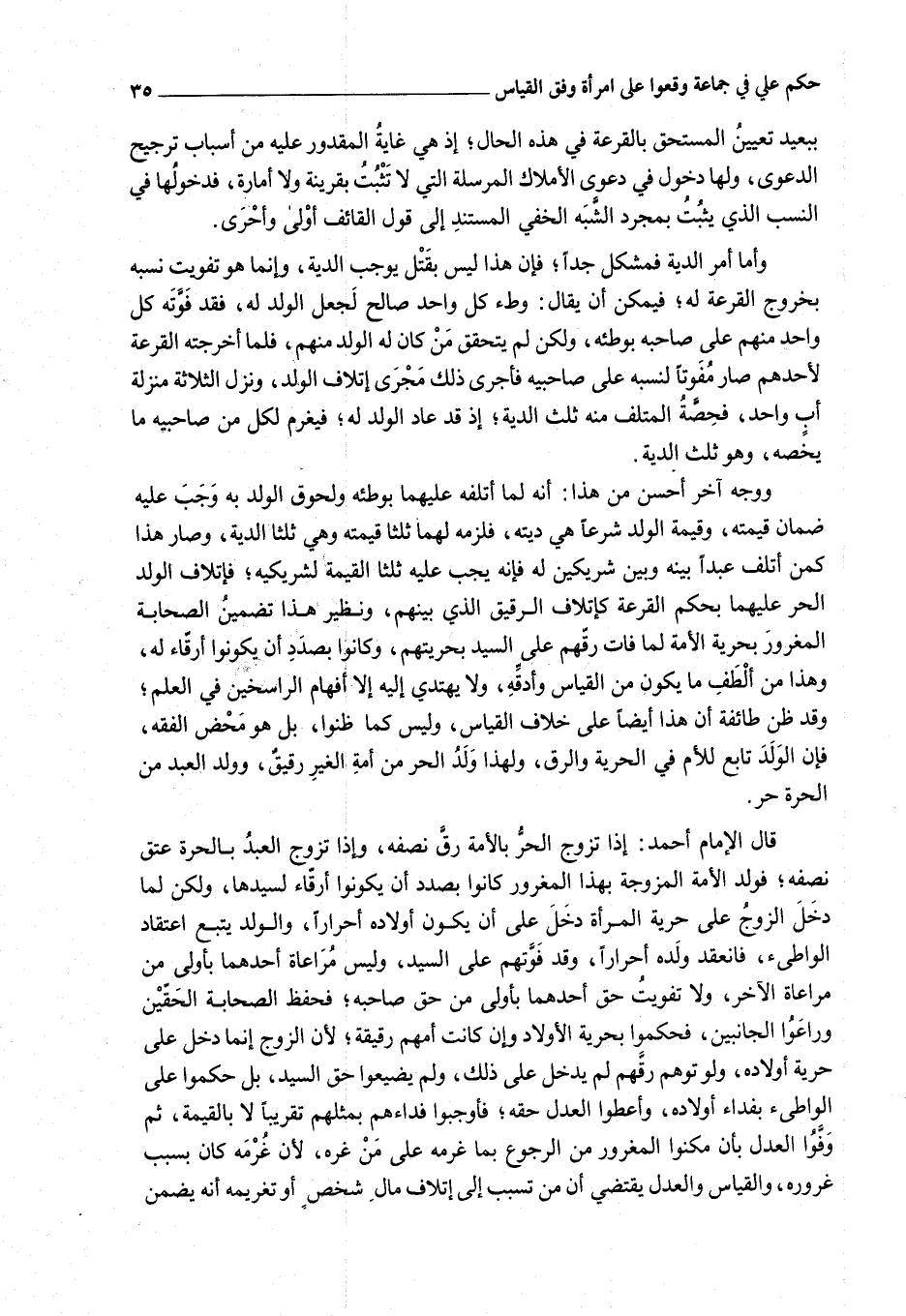 قَالَ الْإِمَامُ أَحْمَدُ: إذَا تَزَوَّجَ الْحُرُّ بِالْأَمَةِ رُقَّ نِصْفُهُ، وَإِذَا تَزَوَّجَ الْعَبْدُ بِالْحُرَّةِ عَتَقَ نِصْفُهُ؛ فَوَلَدُ الْأَمَةِ الْمُزَوَّجَةِ بِهَذَا الْمَغْرُورِ كَانُوا بِصَدَدِ أَنْ يَكُونُوا أَرِقَّاءَ لِسَيِّدِهَا، وَلَكِنْ لَمَّا دَخَلَ الزَّوْجُ عَلَى حُرِّيَّةِ الْمَرْأَةِ دَخَلَ عَلَى أَنْ يَكُونَ أَوْلَادُهُ أَحْرَارًا، وَالْوَلَدُ يَتْبَعُ اعْتِقَادَ الْوَاطِئِ، فَانْعَقَدَ وَلَدُهُ أَحْرَارًا، وَقَدْ فَوَّتَهُمْ عَلَى السَّيِّدِ، وَلَيْسَ مُرَاعَاةُ أَحَدِهِمَا بِأَوْلَى مِنْ مُرَاعَاةِ الْآخَرِ، وَلَا تَفْوِيتُ حَقِّ أَحَدِهِمَا بِأَوْلَى مِنْ حَقِّ صَاحِبِهِ؛ فَحَفِظَ الصَّحَابَةُ الْحَقَّيْنِ وَرَاعُوا الْجَانِبَيْنِ، فَحَكَمُوا بِحُرِّيَّةِ الْأَوْلَادِ وَإِنْ كَانَتْ أُمُّهُمْ رَقِيقَةً؛ لِأَنَّ الزَّوْجَ إنَّمَا دَخَلَ عَلَى حُرِّيَّةِ أَوْلَادِهِ، وَلَوْ تَوَهَّمَ رِقَّهُمْ لَمْ يَدْخُلْ عَلَى ذَلِكَ، وَلَمْ يُضَيِّعُوا حَقَّ السَّيِّدِ، بَلْ حَكَمُوا عَلَى الْوَاطِئِ بِفِدَاءِ أَوْلَادِهِ، وَأَعْطُوا الْعَدْلَ حَقَّهُ؛ فَأَوْجَبُوا فِدَاءَهُمْ بِمِثْلِهِمْ تَقْرِيبًا لَا بِالْقِيمَةِ، ثُمَّ وَفُّوا الْعَدْلَ بِأَنْ مَكَّنُوا الْمَغْرُورَ مِنْ الرُّجُوعِ بِمَا غَرِمَهُ عَلَى مَنْ غَرَّهُ؛ لِأَنَّ غُرْمَهُ كَانَ بِسَبَبِ غُرُورِهِ، وَالْقِيَاسُ وَالْعَدْلُ يَقْتَضِي أَنَّ مَنْ تَسَبَّبَ إلَى إتْلَافِ مَالِ شَخْصٍ أَوْ تَغْرِيمِهِ أَنَّهُ يَضْمَنُ