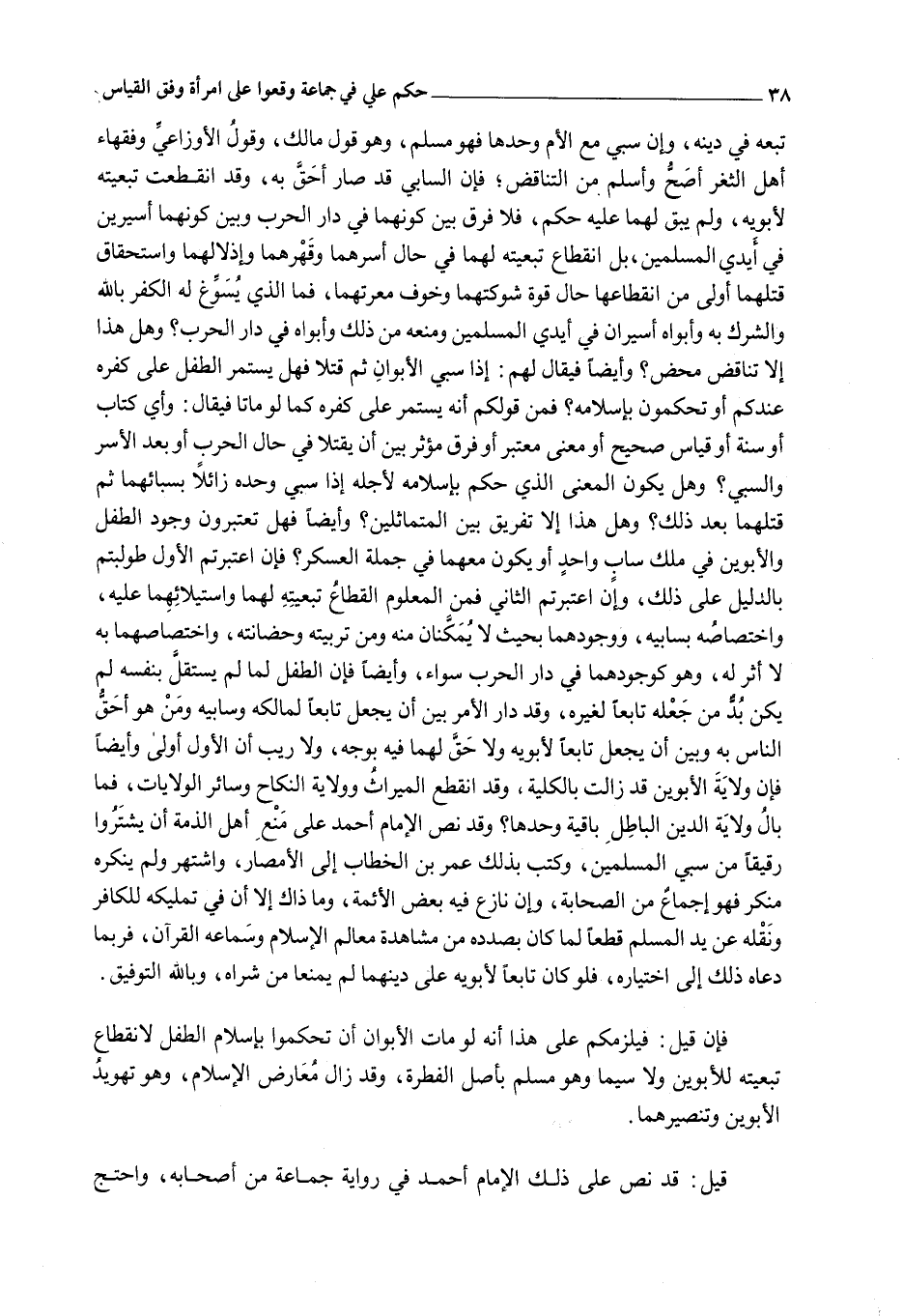 فَإِنْ اعْتَبَرْتُمْ الْأَوَّلَ طُولِبْتُمْ بِالدَّلِيلِ عَلَى ذَلِكَ، وَإِنْ اعْتَبَرْتُمْ الثَّانِيَ فَمِنْ الْمَعْلُومِ انْقِطَاعُ تَبَعِيَّتِهِ لَهُمَا وَاسْتِيلَائِهِمَا عَلَيْهِ، وَاخْتِصَاصِهِ بِسَابِيهِ، وَوُجُودِهِمَا بِحَيْثُ لَا يُمَكَّنَانِ مِنْهُ وَمِنْ تَرْبِيَتِهِ وَحَضَانَتِهِ، وَاخْتِصَاصِهِمَا بِهِ لَا أَثَرَ لَهُ، وَهُوَ كَوُجُودِهِمَا فِي دَارِ الْحَرْبِ سَوَاءٌ، وَأَيْضًا فَإِنَّ الطِّفْلَ لَمَّا لَمْ يَسْتَقِلَّ بِنَفْسِهِ لَمْ يَكُنْ بُدٌّ مِنْ جَعْلِهِ تَابِعًا لِغَيْرِهِ، وَقَدْ دَارَ الْأَمْرُ بَيْنَ أَنْ يُجْعَلَ تَابِعًا لِمَالِكِهِ وَسَابِيهِ وَمَنْ هُوَ أَحَقُّ النَّاسِ بِهِ وَبَيْنَ أَنْ يُجْعَلَ تَابِعًا لِأَبَوَيْهِ وَلَا حَقَّ لَهُمَا فِيهِ بِوَجْهٍ، وَلَا رَيْبَ أَنَّ الْأَوَّلَ أَوْلَى وَأَيْضًا فَإِنَّ وِلَايَةَ الْأَبَوَيْنِ قَدْ زَالَتْ بِالْكُلِّيَّةِ، وَقَدْ انْقَطَعَ الْمِيرَاثُ وَوِلَايَةُ النِّكَاحِ وَسَائِرِ الْوِلَايَاتِ، فَمَا بَالُ وِلَايَةِ الدَّيْنِ الْبَاطِلِ بَاقِيَةٌ وَحْدَهَا؟