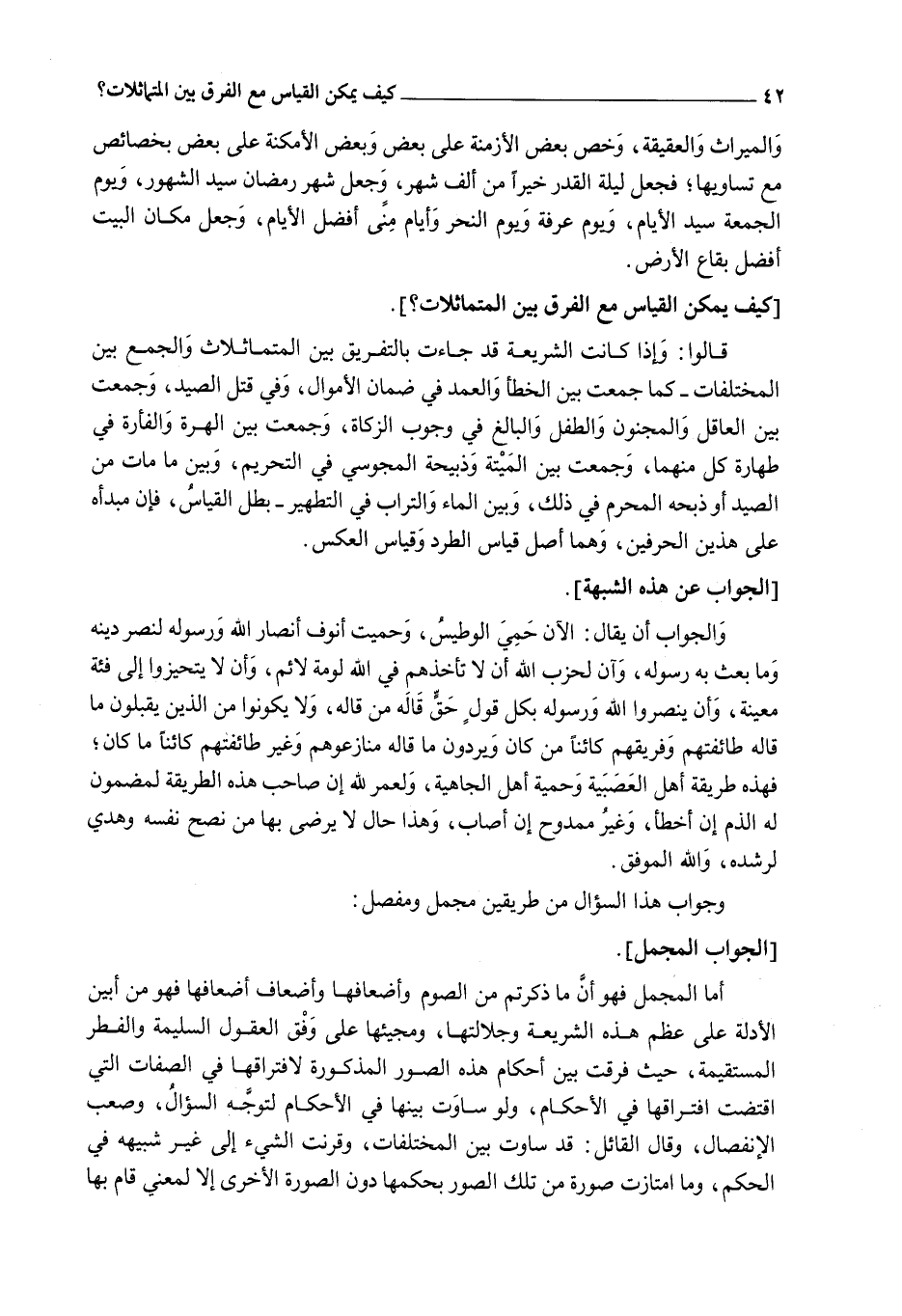 أَمَّا الْمُجْمَلُ فَهُوَ أَنَّ مَا ذَكَرْتُمْ مِنْ الصَّوْمِ وَأَضْعَافِهَا وَأَضْعَافِ أَضْعَافِهَا فَهُوَ مِنْ أَبْيَنِ الْأَدِلَّةِ عَلَى عِظَمِ هَذِهِ الشَّرِيعَةِ وَجَلَالَتِهَا، وَمَجِيئُهَا عَلَى وَفْقِ الْعُقُولِ السَّلِيمَةِ وَالْفِطَرِ الْمُسْتَقِيمَةِ، حَيْثُ فَرَّقَتْ بَيْنَ أَحْكَامِ هَذِهِ الصُّوَرِ الْمَذْكُورَةِ لِافْتِرَاقِهَا فِي الصِّفَاتِ الَّتِي اقْتَضَتْ افْتِرَاقَهَا فِي الْأَحْكَامِ، وَلَوْ سَاوَتْ بَيْنَهَا فِي الْأَحْكَامِ لَتَوَجَّهَ السُّؤَالُ، وَصَعُبَ الِانْفِصَالُ، وَقَالَ الْقَائِلُ: قَدْ سَاوَتْ بَيْنَ الْمُخْتَلِفَاتِ، وَقَرَنَتْ الشَّيْءَ إلَى غَيْرِ شَبِيهِهِ فِي الْحُكْمِ، وَمَا امْتَازَتْ صُورَةٌ مِنْ تِلْكَ الصُّوَرِ بِحُكْمِهَا دُونَ الصُّورَةِ الْأُخْرَى إلَّا لِمَعْنًى قَامَ بِهَا