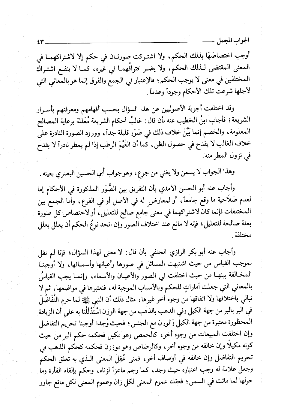 وَأَجَابَ عَنْهُ أَبُو بَكْرٍ الرَّازِيّ الْحَنَفِيُّ بِأَنْ قَالَ: لَا مَعْنَى لِهَذَا السُّؤَالِ؛ فَإِنَّا لَمْ نَقُلْ بِمُوجَبِ الْقِيَاسِ مِنْ حَيْثُ اشْتَبَهَتْ الْمَسَائِلُ فِي صُوَرِهَا وَأَعْيَانِهَا وَأَسْمَائِهَا، وَلَا أَوْجَبْنَا الْمُخَالَفَةَ بَيْنَهَا مِنْ حَيْثُ اخْتَلَفَتْ فِي الصُّوَرِ وَالْأَعْيَانِ وَالْأَسْمَاءِ، وَإِنَّمَا يَجِبُ الْقِيَاسُ بِالْمَعَانِي الَّتِي جُعِلَتْ أَمَارَاتٌ لِلْحُكْمِ وَبِالْأَسْبَابِ الْمُوجِبَةِ لَهُ، فَنَعْتَبِرُهَا فِي مَوَاضِعِهَا، ثُمَّ لَا نُبَالِي بِاخْتِلَافِهَا وَلَا اتِّفَاقِهَا مِنْ وُجُوهٍ أُخَرَ غَيْرَهَا، مِثَالُ ذَلِكَ أَنَّ النَّبِيَّ - صَلَّى اللَّهُ عَلَيْهِ وَسَلَّمَ - لَمَّا حَرَّمَ التَّفَاضُلَ فِي الْبُرِّ بِالْبُرِّ مِنْ جِهَةِ الْكَيْلِ وَفِي الذَّهَبِ بِالذَّهَبِ مِنْ جِهَةِ الْوَزْنِ اسْتَدْلَلْنَا بِهِ عَلَى أَنَّ الزِّيَادَةَ الْمَحْظُورَةَ مُعْتَبَرَةٌ مِنْ جِهَةِ الْكَيْلِ وَالْوَزْنِ مَعَ الْجِنْسِ؛ فَحَيْثُ وُجِدَا أَوْجَبْنَا تَحْرِيمَ التَّفَاضُلِ وَإِنْ اخْتَلَفَتْ الْمَبِيعَاتُ مِنْ وُجُوهٍ أُخَرَ، كَالْحِمَّصِ وَهُوَ مَكِيلٌ فَحُكْمُهُ حُكْمُ الْبُرِّ مِنْ حَيْثُ كَوْنُهُ مَكِيلًا وَإِنْ خَالَفَهُ مِنْ وُجُوهٍ أُخَرَ، وَكَالرَّصَاصِ وَهُوَ مَوْزُونٌ فَحُكْمُهُ كَحُكْمِ الذَّهَبِ فِي تَحْرِيمِ التَّفَاضُلِ وَإِنْ خَالَفَهُ فِي أَوْصَافٍ أُخَرَ، فَمَتَى عَقَلَ الْمَعْنَى الَّذِي بِهِ تَعَلَّقَ الْحُكْمُ وَجُعِلَ عَلَامَةً لَهُ؛ وَجَبَ اعْتِبَارُهُ حَيْثُ وُجِدَ، كَمَا رَجَمَ مَاعِزًا لِزِنَاهُ، وَحَكَمَ بِإِلْقَاءِ الْفَأْرَةِ وَمَا حَوْلَهَا لَمَّا مَاتَتْ فِي السَّمْنِ؛ فَعَقَلْنَا عُمُومَ الْمَعْنَى لِكُلِّ زَانٍ وَعُمُومَ الْمَعْنَى لِكُلِّ مَائِعٍ جَاوَرَ