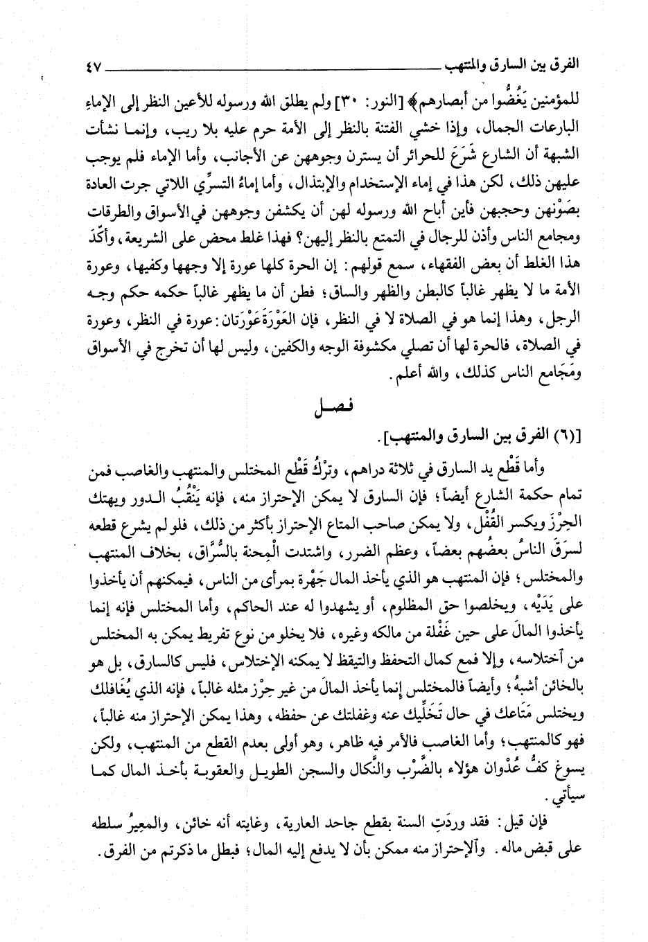 وَأَمَّا قَطْعُ يَدِ السَّارِقِ فِي ثَلَاثَةِ دَرَاهِمَ، وَتَرْكُ قَطْعِ الْمُخْتَلِسِ وَالْمُنْتَهِبِ وَالْغَاصِبِ فَمِنْ تَمَامِ حِكْمَةِ الشَّارِعِ أَيْضًا؛ فَإِنَّ السَّارِقَ لَا يُمْكِنُ الِاحْتِرَازُ مِنْهُ، فَإِنَّهُ يَنْقُبُ الدُّورَ وَيَهْتِكُ الْحِرْزَ وَيَكْسِرُ الْقُفْلَ، وَلَا يُمْكِنُ صَاحِبَ الْمَتَاعِ الِاحْتِرَازُ بِأَكْثَرَ مِنْ ذَلِكَ، فَلَوْ لَمْ يَشْرَعْ قَطْعَهُ لَسَرَقَ النَّاسُ بَعْضَهُمْ بَعْضًا، وَعَظُمَ الضَّرَرُ، وَاشْتَدَّتْ الْمِحْنَةُ بِالسُّرَّاقِ، بِخِلَافِ الْمُنْتَهِبِ وَالْمُخْتَلِسِ؛ فَإِنَّ الْمُنْتَهِبَ هُوَ الَّذِي يَأْخُذُ الْمَالَ جَهْرَةً بِمَرْأَى مِنْ النَّاسِ، فَيُمْكِنُهُمْ أَنْ يَأْخُذُوا عَلَى يَدَيْهِ، وَيُخَلِّصُوا حَقَّ الْمَظْلُومِ، أَوْ يَشْهَدُوا لَهُ عِنْدَ الْحَاكِمِ، وَأَمَّا الْمُخْتَلِسُ فَإِنَّهُ إنَّمَا يَأْخُذُ الْمَالَ عَلَى حِينِ غَفْلَةٍ مِنْ مَالِكِهِ وَغَيْرِهِ، فَلَا يَخْلُو مِنْ نَوْعِ تَفْرِيطٍ يُمَكِّنُ بِهِ الْمُخْتَلِسَ مِنْ اخْتِلَاسِهِ، وَإِلَّا فَمَعَ كَمَالِ التَّحَفُّظِ وَالتَّيَقُّظِ لَا يُمْكِنُهُ الِاخْتِلَاسُ، فَلَيْسَ كَالسَّارِقِ، بَلْ هُوَ بِالْخَائِنِ أَشْبَهُ؛ وَأَيْضًا فَالْمُخْتَلِسُ إنَّمَا يَأْخُذُ الْمَالَ مِنْ غَيْرِ حِرْزِ مِثْلِهِ غَالِبًا، فَإِنَّهُ الَّذِي يُغَافِلُكَ وَيَخْتَلِسُ مَتَاعَكَ فِي حَالِ تَخَلِّيكَ عَنْهُ وَغَفْلَتِكَ عَنْ حِفْظِهِ، وَهَذَا يُمْكِنُ الِاحْتِرَازُ مِنْهُ غَالِبًا، فَهُوَ كَالْمُنْتَهِبِ؛ وَأَمَّا الْغَاصِبُ فَالْأَمْر فِيهِ ظَاهِرٌ، وَهُوَ أَوْلَى بِعَدَمِ الْقَطْعِ مِنْ الْمُنْتَهِبِ، وَلَكِنْ يَسُوغُ كَفُّ عُدْوَانِ هَؤُلَاءِ بِالضَّرْبِ وَالنَّكَالِ وَالسِّجْنِ الطَّوِيلِ وَالْعُقُوبَةِ بِأَخْذِ الْمَالِ كَمَا سَيَأْتِي.