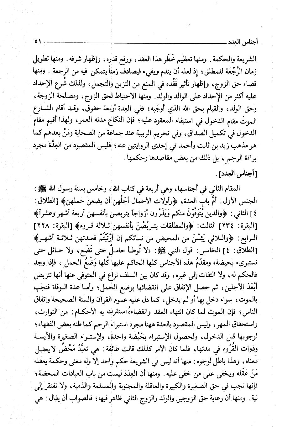 الْمَقَامُ الثَّانِي فِي أَجْنَاسِهَا، وَهِيَ أَرْبَعَةٌ فِي كِتَابِ اللَّهِ، وَخَامِسٌ بِسُنَّةِ رَسُولِ اللَّهِ - صَلَّى اللَّهُ عَلَيْهِ وَسَلَّمَ -: الْجِنْسُ الْأَوَّلُ: أُمُّ بَابِ الْعِدَّةِ، {وَأُولاتُ الأَحْمَالِ أَجَلُهُنَّ أَنْ يَضَعْنَ حَمْلَهُنَّ} [الطلاق: 4] الثَّانِي: {وَالَّذِينَ يُتَوَفَّوْنَ مِنْكُمْ وَيَذَرُونَ أَزْوَاجًا يَتَرَبَّصْنَ بِأَنْفُسِهِنَّ أَرْبَعَةَ أَشْهُرٍ وَعَشْرًا} [البقرة: 234] الثَّالِثُ: {وَالْمُطَلَّقَاتُ يَتَرَبَّصْنَ بِأَنْفُسِهِنَّ ثَلاثَةَ قُرُوءٍ} [البقرة: 228] الرَّابِعُ: {وَاللائِي يَئِسْنَ مِنَ الْمَحِيضِ مِنْ نِسَائِكُمْ إِنِ ارْتَبْتُمْ فَعِدَّتُهُنَّ ثَلاثَةُ أَشْهُرٍ} [الطلاق: 4] الْخَامِسُ: قَوْلُ النَّبِيِّ - صَلَّى اللَّهُ عَلَيْهِ وَسَلَّمَ -: «لَا تُوطَأُ حَامِلٌ حَتَّى تَضَعَ، وَلَا حَائِلٌ حَتَّى تَسْتَبْرِئَ بِحَيْضَةٍ» وَمُقَدَّمُ هَذِهِ الْأَجْنَاسِ كُلِّهَا الْحَاكِمُ عَلَيْهَا كُلِّهَا وَضْعُ الْحَمْلِ، فَإِذَا وُجِدَ فَالْحُكْمُ لَهُ، وَلَا الْتِفَاتَ إلَى غَيْرِهِ، وَقَدْ كَانَ بَيْنَ السَّلَفِ نِزَاعٌ فِي الْمُتَوَفَّى عَنْهَا أَنَّهَا تَتَرَبَّصُ أَبْعَدَ الْأَجَلَيْنِ، ثَمَّ حَصَلَ الِاتِّفَاقُ عَلَى انْقِضَائِهَا بِوَضْعِ الْحَمْلِ؛ وَأَمَّا عِدَّةُ الْوَفَاةِ فَتَجِبُ بِالْمَوْتِ، سَوَاءٌ دَخَلَ بِهَا أَوْ لَمْ يَدْخُلْ، كَمَا دَلَّ عَلَيْهِ عُمُومُ الْقُرْآنِ وَالسُّنَّةِ الصَّحِيحَةِ وَاتِّفَاقُ النَّاسِ؛ فَإِنَّ الْمَوْتَ لَمَّا كَانَ انْتِهَاءَ الْعَقْدِ وَانْقِضَاءَهُ اسْتَقَرَّتْ بِهِ الْأَحْكَامُ: مِنْ التَّوَارُثِ، وَاسْتِحْقَاقِ الْمَهْرِ، وَلَيْسَ الْمَقْصُودُ بِالْعِدَّةِ هَا هُنَا مُجَرَّدَ اسْتِبْرَاءِ الرَّحِمِ كَمَا ظَنَّهُ بَعْضُ الْفُقَهَاءِ؛ لِوُجُوبِهَا قَبْلَ الدُّخُولِ، وَلِحُصُولِ الِاسْتِبْرَاءِ بِحَيْضَةٍ وَاحِدَةٍ، وَلِاسْتِوَاءِ الصَّغِيرَةِ وَالْآيِسَةِ وَذَوَاتِ الْقُرُوءِ فِي مُدَّتِهَا، فَلَمَّا كَانَ الْأَمْرُ كَذَلِكَ قَالَتْ طَائِفَةٌ: هِيَ تَعَبُّدٌ مَحْضٌ لَا يُعْقَلُ مَعْنَاهُ، وَهَذَا بَاطِلٌ لِوُجُوهٍ: مِنْهَا أَنَّهُ لَيْسَ فِي الشَّرِيعَةِ حُكْمٌ وَاحِدٌ إلَّا وَلَهُ مَعْنًى وَحِكْمَةٌ يَعْقِلُهُ مَنْ عَقَلَهُ وَيَخْفَى عَلَى مَنْ خَفِيَ عَلَيْهِ.