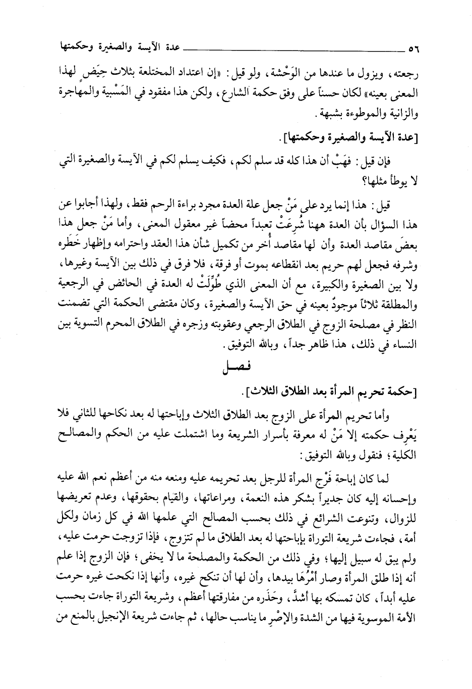 فَإِنْ قِيلَ: فَهَبْ أَنَّ هَذَا كُلَّهُ قَدْ سَلِمَ لَكُمْ، فَكَيْفَ يَسْلَمُ لَكُمْ فِي الْآيِسَةِ وَالصَّغِيرَةِ الَّتِي لَا يُوطَأُ مِثْلُهَا؟ قِيلَ: هَذَا إنَّمَا يُرَدُّ عَلَى مَنْ جَعَلَ عِلَّةَ الْعِدَّةِ مُجَرَّدَ بَرَاءَةِ الرَّحِمِ فَقَطْ، وَلِهَذَا أَجَابُوا عَنْ هَذَا السُّؤَالِ بِأَنَّ الْعِدَّةَ هَا هُنَا شُرِعَتْ تَعَبُّدًا مَحْضًا غَيْرُ مَعْقُولِ الْمَعْنَى، وَأَمَّا مَنْ جَعَلَ هَذَا بَعْضَ مَقَاصِدِ الْعِدَّةِ وَأَنَّ لَهَا مَقَاصِدَ أُخَرَ مِنْ تَكْمِيلِ شَأْنِ هَذَا الْعَقْدِ وَاحْتِرَامِهِ وَإِظْهَارِ خَطَرِهِ وَشَرَفِهِ فَجُعِلَ لَهُمْ حَرِيمٌ بَعْدَ انْقِطَاعِهِ بِمَوْتٍ أَوْ فُرْقَةٍ، فَلَا فَرْقَ فِي ذَلِكَ بَيْنَ الْآيِسَةِ وَغَيْرِهَا، وَلَا بَيْنَ الصَّغِيرَةِ وَالْكَبِيرَةِ، مَعَ أَنَّ الْمَعْنَى الَّذِي طُوِّلَتْ لَهُ الْعِدَّةُ فِي الْحَائِضِ فِي الرَّجْعِيَّةِ وَالْمُطَلَّقَةِ ثَلَاثًا مَوْجُودٌ بِعَيْنِهِ فِي حَقِّ الْآيِسَةِ وَالصَّغِيرَةِ، وَكَانَ مُقْتَضَى الْحِكْمَةِ الَّتِي تَضَمَّنَتْ النَّظَرَ فِي مَصْلَحَةِ الزَّوْجِ فِي الطَّلَاقِ الرَّجْعِيِّ وَعُقُوبَتِهِ وَزَجْرِهِ فِي الطَّلَاقِ الْمُحَرِّمِ التَّسْوِيَةَ بَيْنَ النِّسَاءِ فِي ذَلِكَ، هَذَا ظَاهِرٌ جِدًّا، وَبِاَللَّهِ التَّوْفِيقُ.
